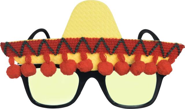 Frames have green-tinted lenses and are topped with a sombrero cut-out with attached decorative pom-poms