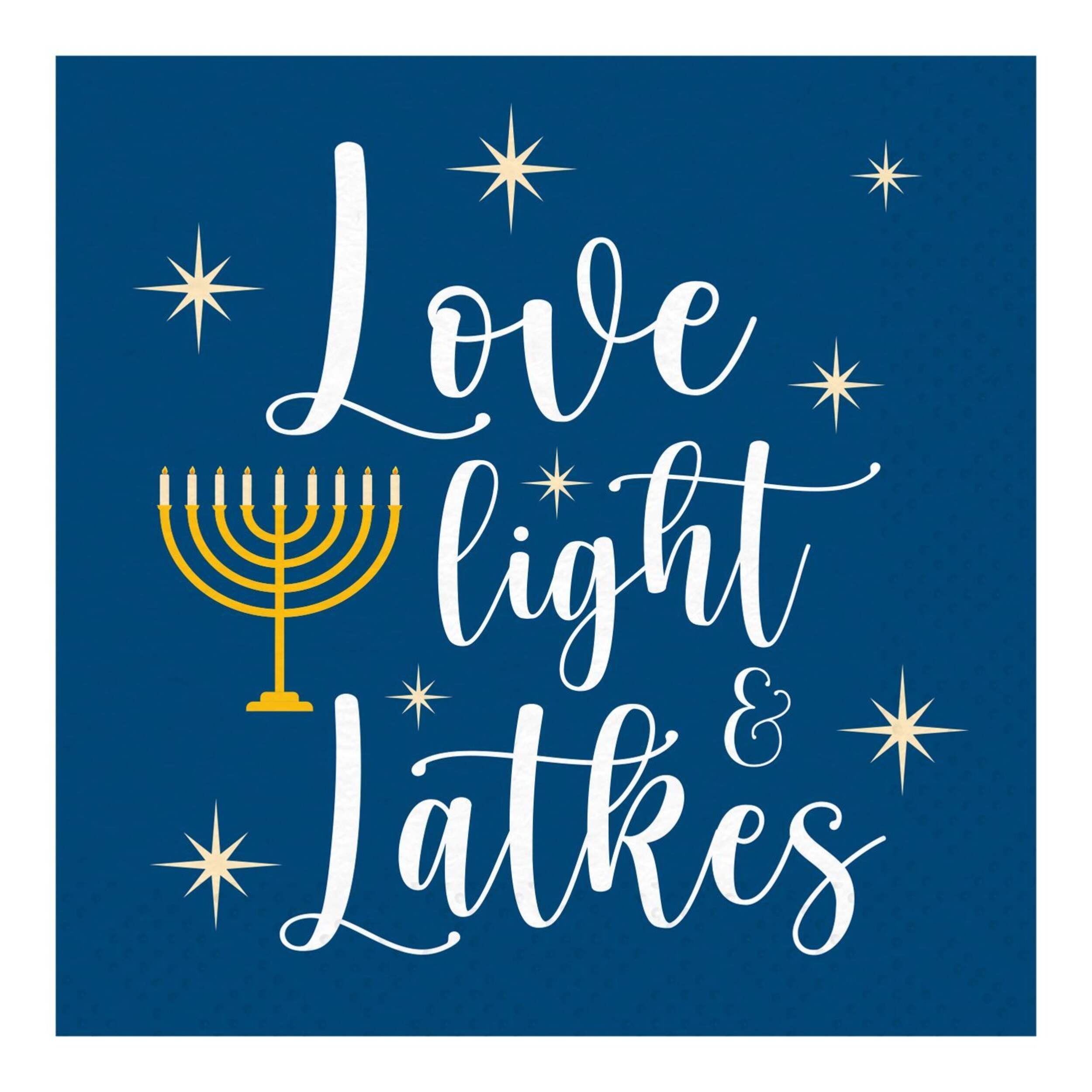 • Blue paper napkins with 'Love Light Latkes' and a gold menorah
