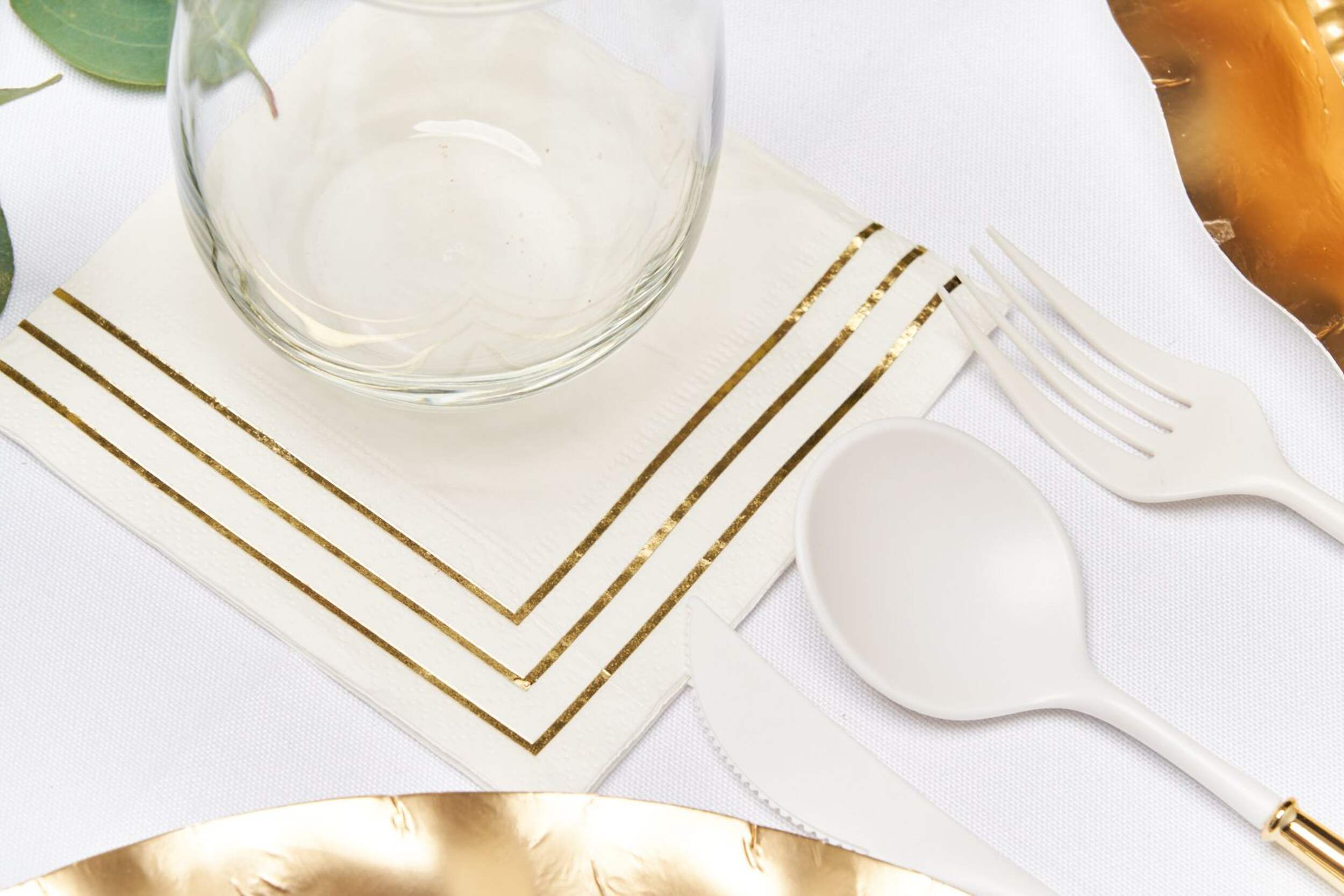 Sophistiplate Satin Luncheon/Salad Plates feature a white background with a gold stripe accent