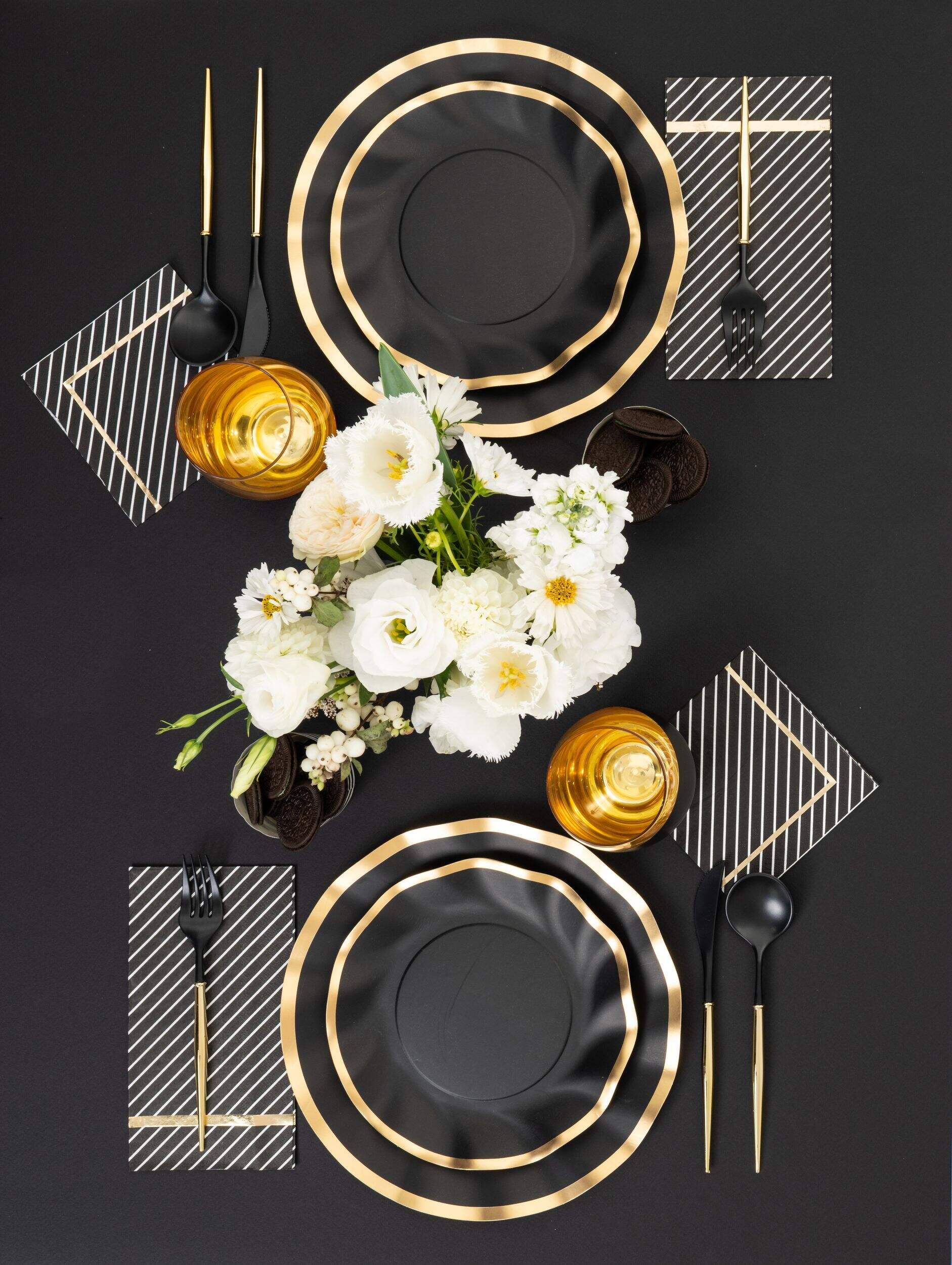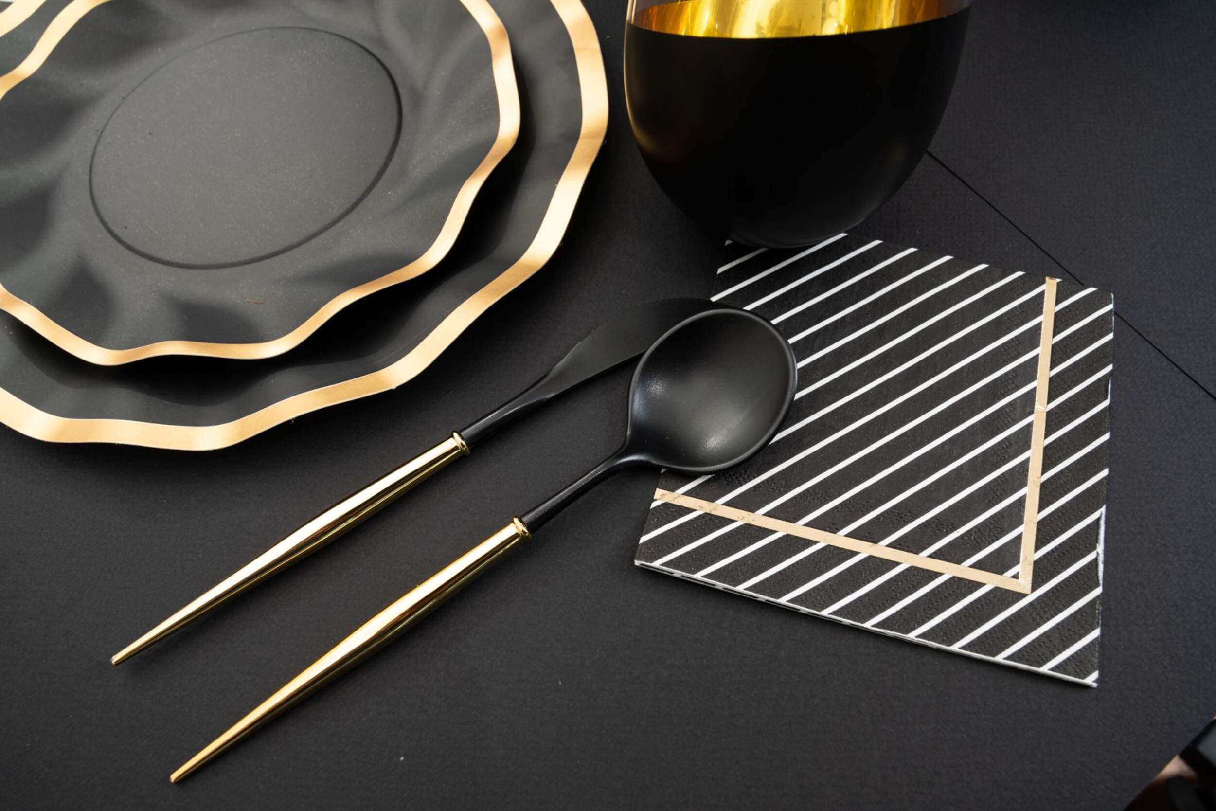 Sophistiplate Solid Black 3-Ply Cocktail Napkins are black trimmed in gold