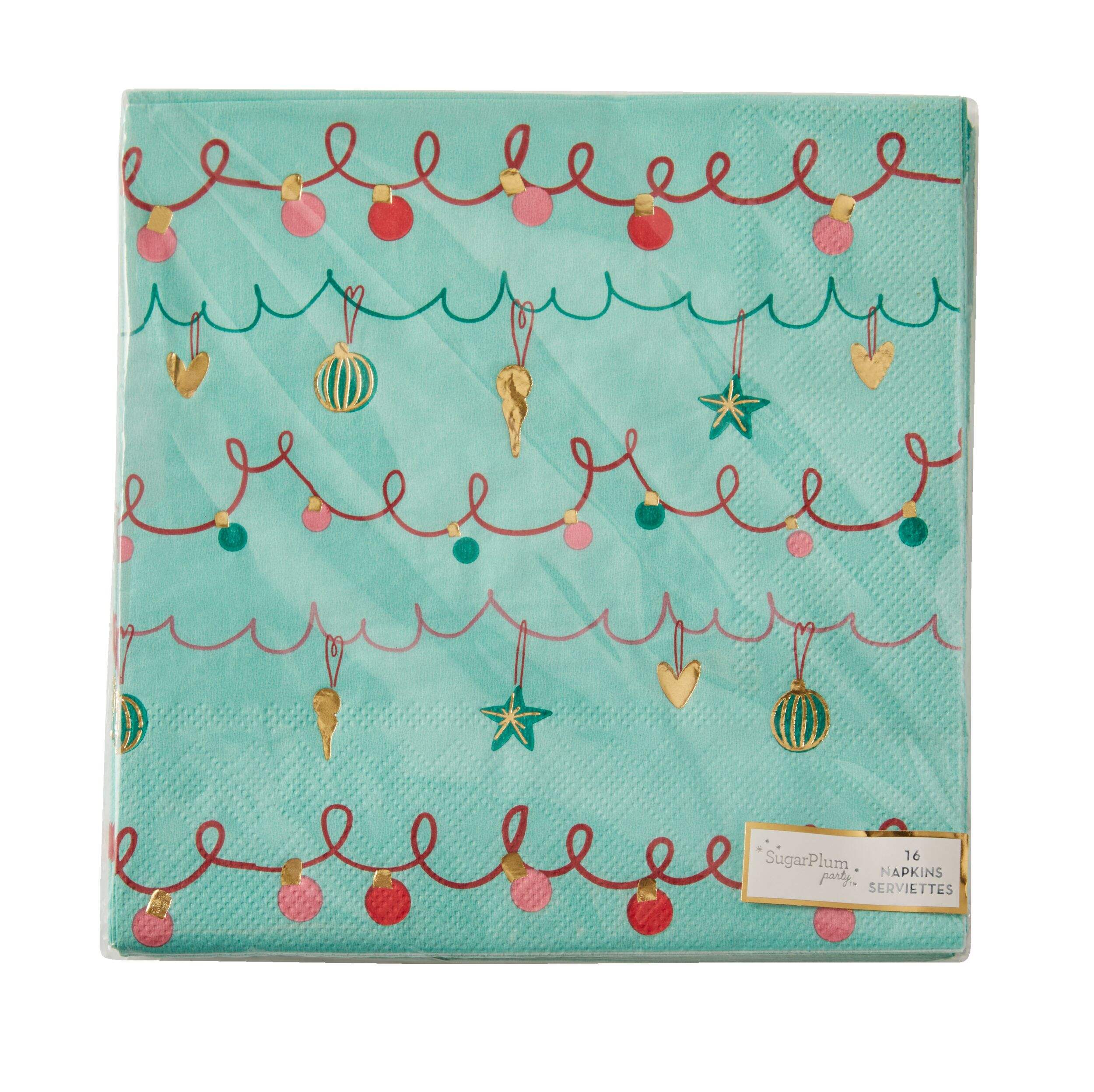 The Sophistiplate Deck the Halls 2-Ply Lunch Napkin pack features lightweight disposable napkins with a whimsical print of ornament accents and green swirls, topped with foil detailing for an extra touch of seasonal sparkle. Each 6.5" x 6.5" napkin is made from 2-ply material that is soft yet durable. With 16 disposable napkins per pack, this set provides plenty of festive flair for lunches and parties.