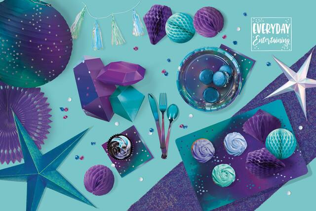 Round paper plates feature an iridescent blue and green background speckled with dots in white and purple