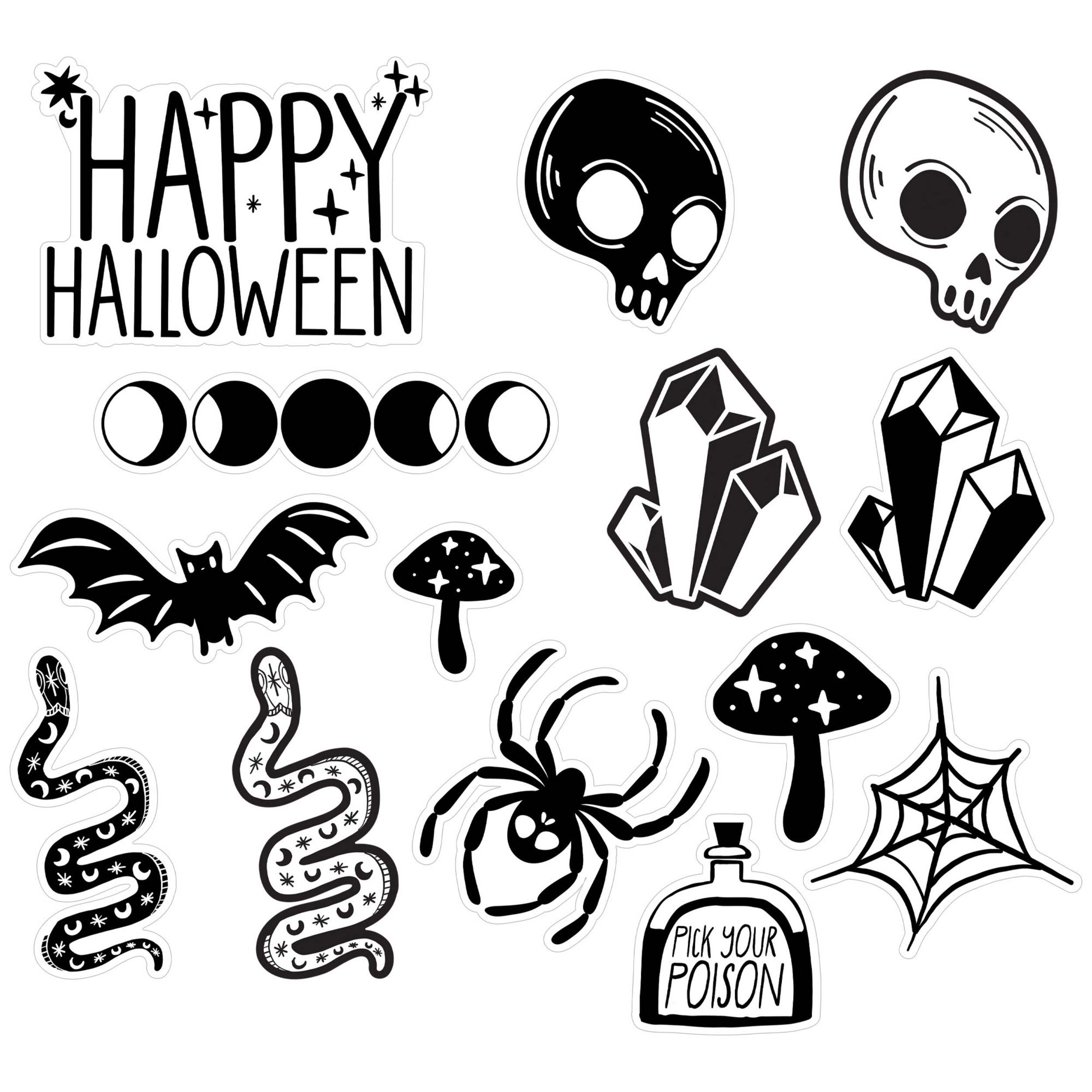 Includes "Happy Halloween", skulls, poison bottle, snake, webs, mushrooms, crystals, spider, bat, and moon phases