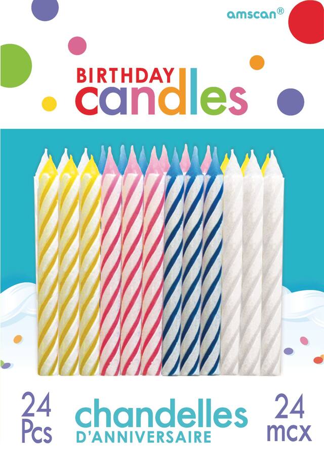 Make any birthday magical with the Amscan Spiral Birthday Candles 24-Pack. The 24 wax candles in this pack each measure 3.2" tall and are covered in glitter to provide a festive sparkle. Place them on birthday cakes, anniversary desserts, or any celebratory sweets to brighten up the occasion. Use candles to match the guest of honour's age or combine them with other glittery candles for a dazzling display. These spiraling candles can help to ensure that any birthdays and special events will shine bright.