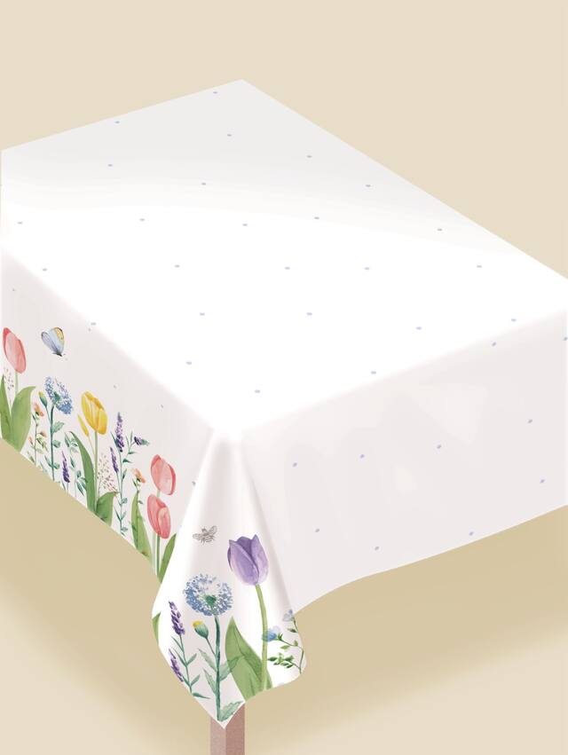Borders of this durable double-layered table protector feature a watercolour-style garden of tulips lavender and dandelions with bees and butterflies fluttering