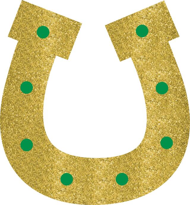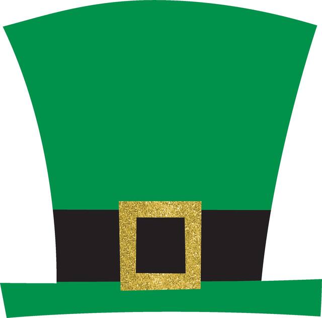 Cardstock cut-outs feature a variety of St. Patrick's Day-themed decorations decorated with glittery accents including shamrocks, Irish flags, a leprechaun, a pot of gold, and more