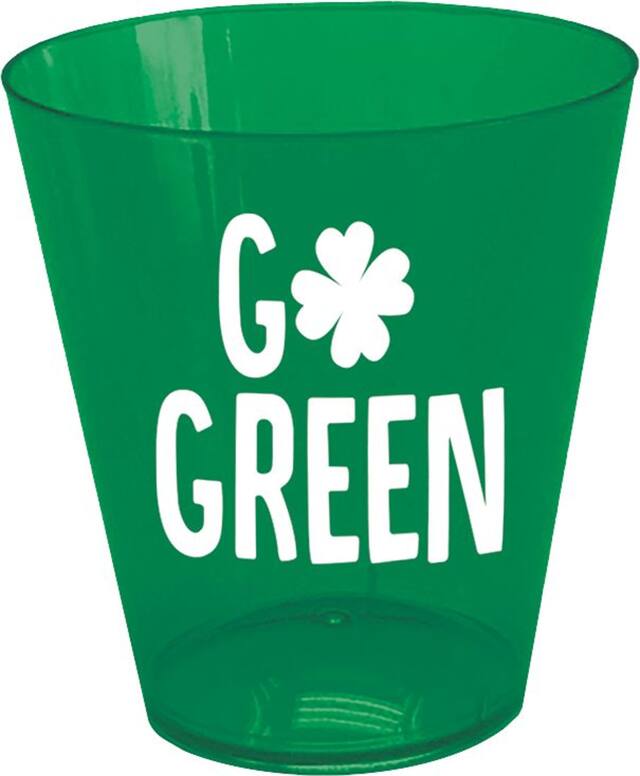 Plastic shot glasses read "Go Green" and come in two shades of green, both with shamrocks in place of the "O"
