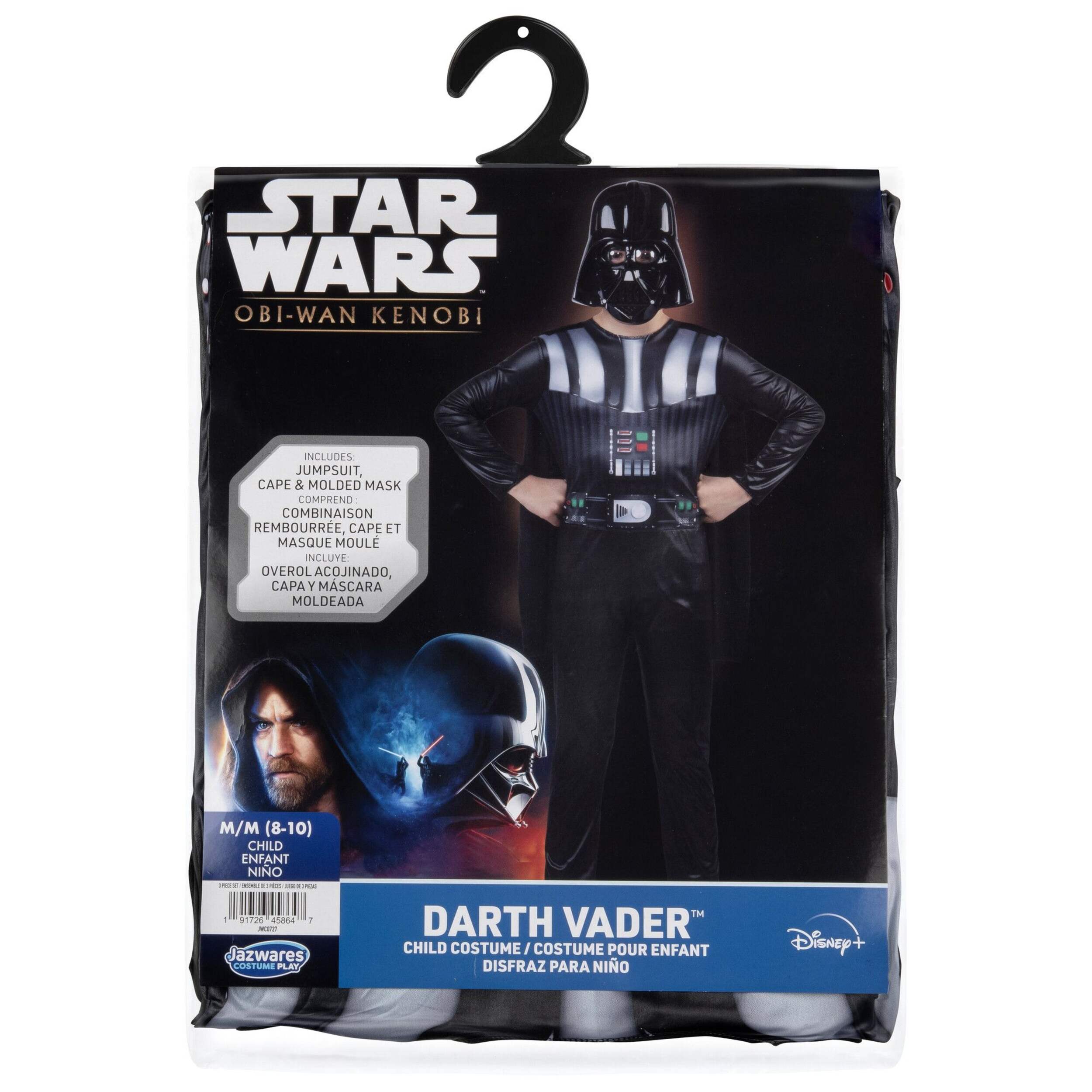 Hunt Jedi in the Star Wars Darth Vader official youth Halloween costume. Based on Vader's iconic armour from Star Wars: Kenobi, this printed jumpsuit includes padding in the chest, arms, and boot tops and closes with a hook and loop fastener. Finally, it comes packed with a plastic mask with elastic strap and detachable cape. All Star Wars costumes are made from high-quality material with high-resolution prints. Jazwares Costume Play creates Halloween fun for every member of the family. Officially licensed Star Wars product from Jazwares.