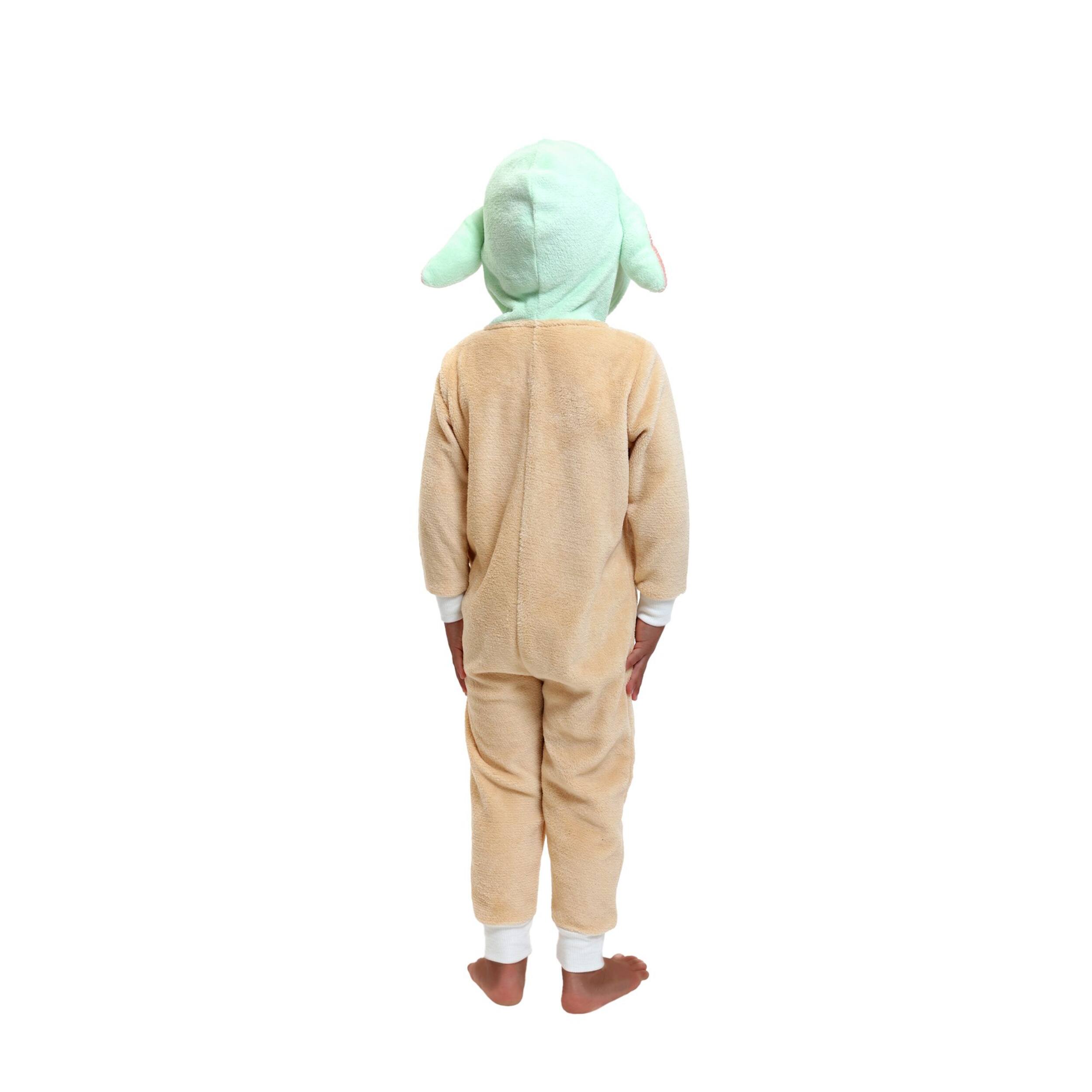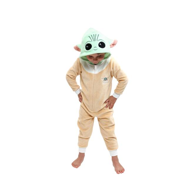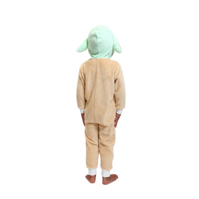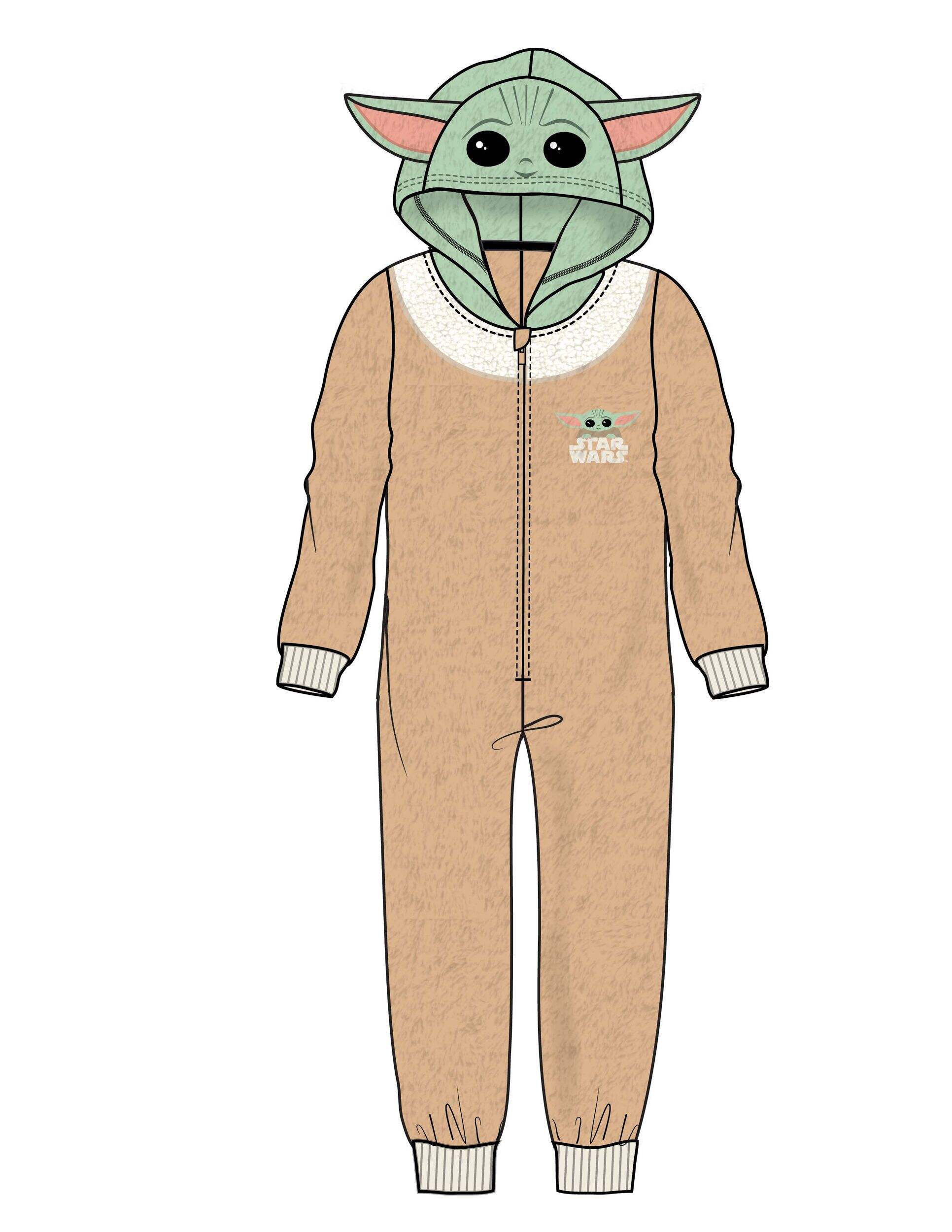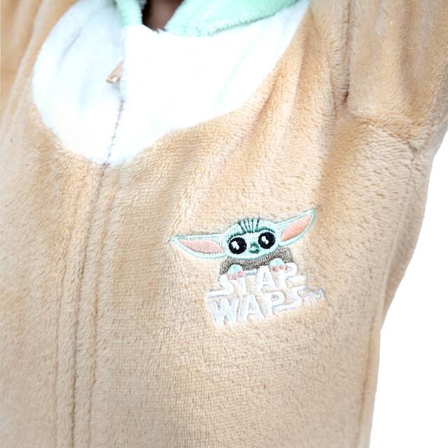 This cozy and warm onesie features a beige jumpsuit with a green hood with Yoda's face on it