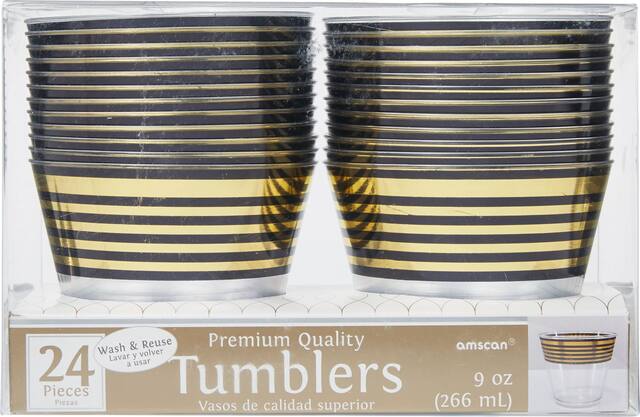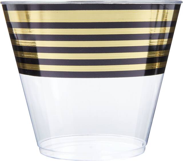 These small clear plastic cups feature a black and metallic gold stripe design on the top