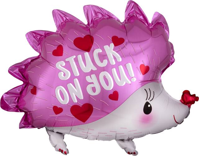 • Pink Stuck on You Hedgehog Balloon resembles a pink hedgehog and features the headline "Stuck On You!" surrounded by red hearts