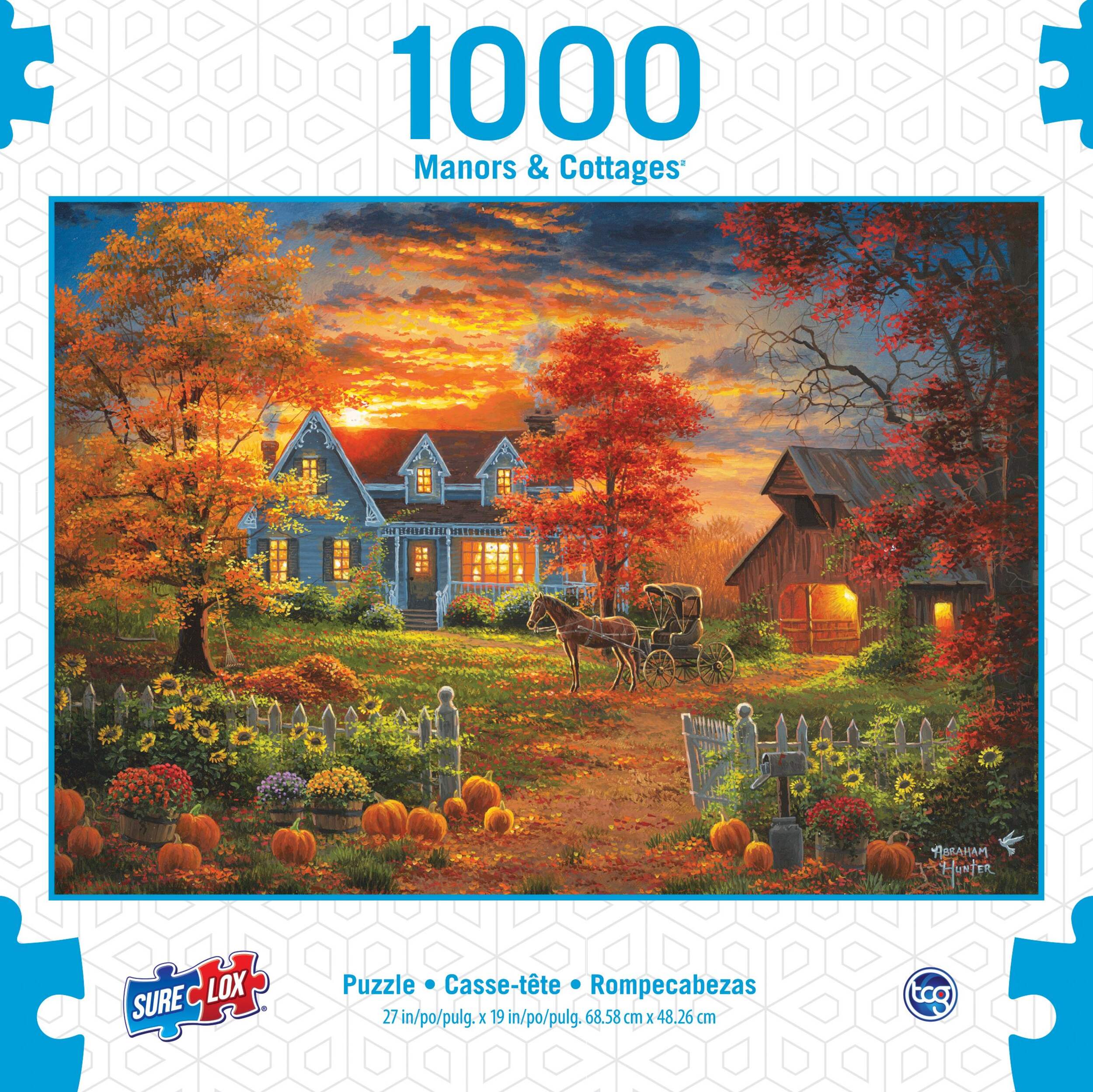Assembled puzzle dimensions are 300 piece (25.5" x 18"), 500 piece (19" x 13"), and 1000 piece (27" x 19")