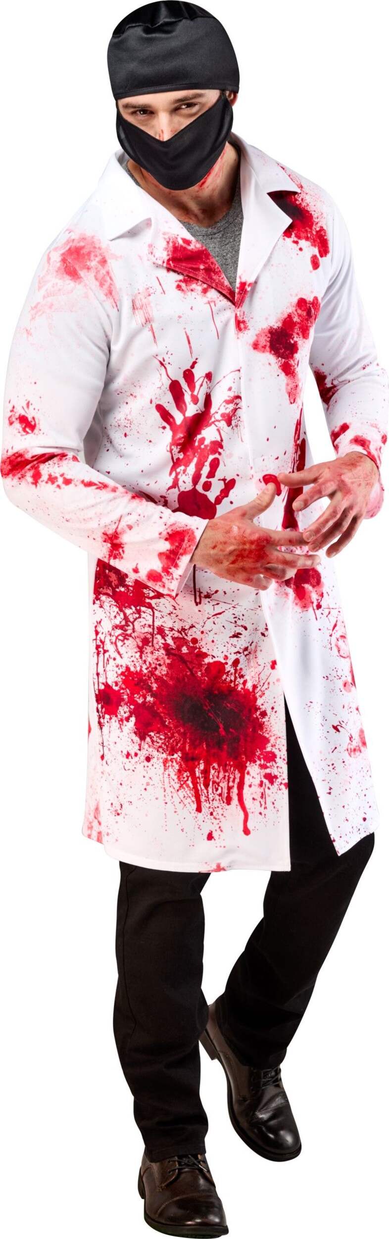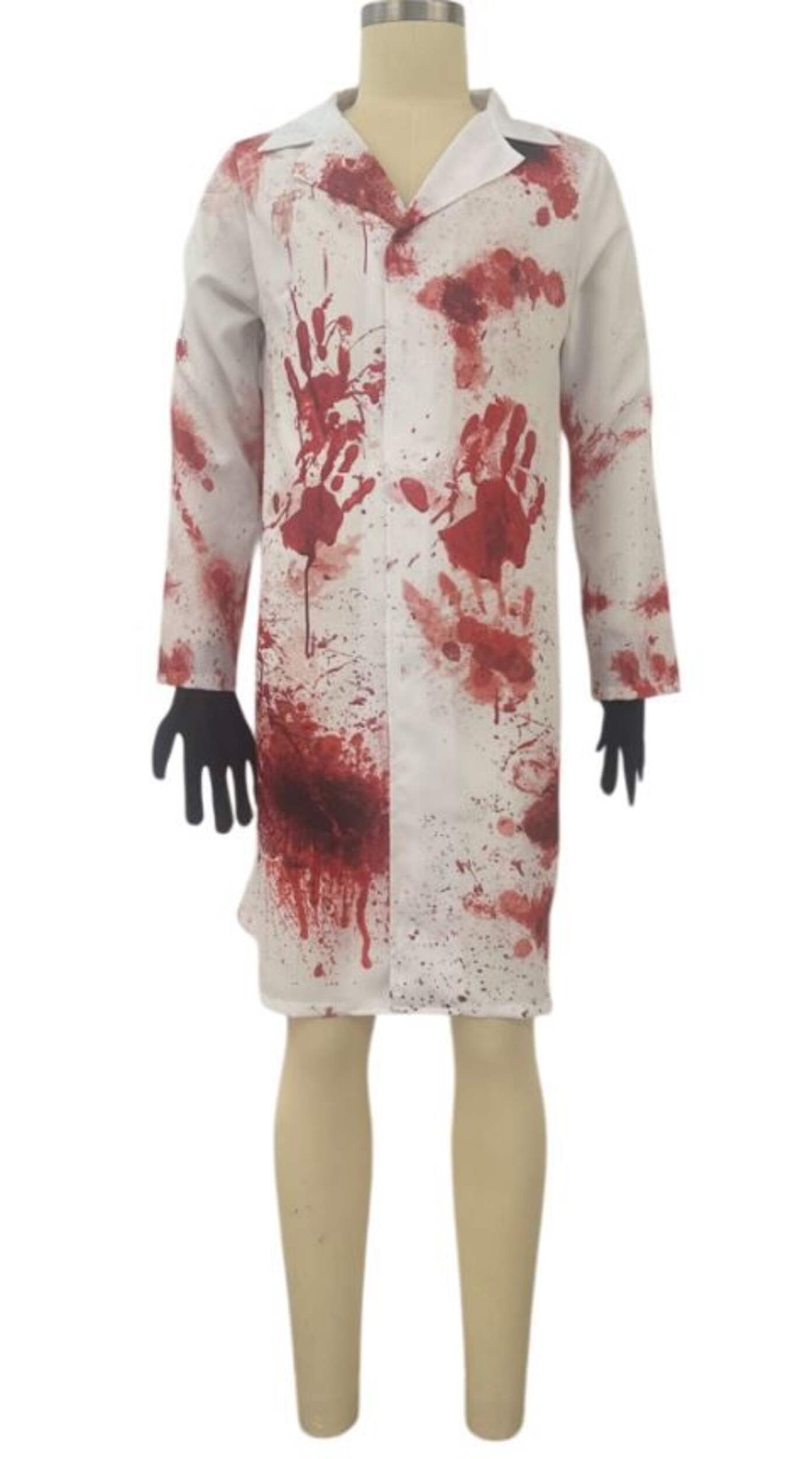This costume features a white lab coat covered in realistic-looking blood splatters and bloody handprints, and black gloves