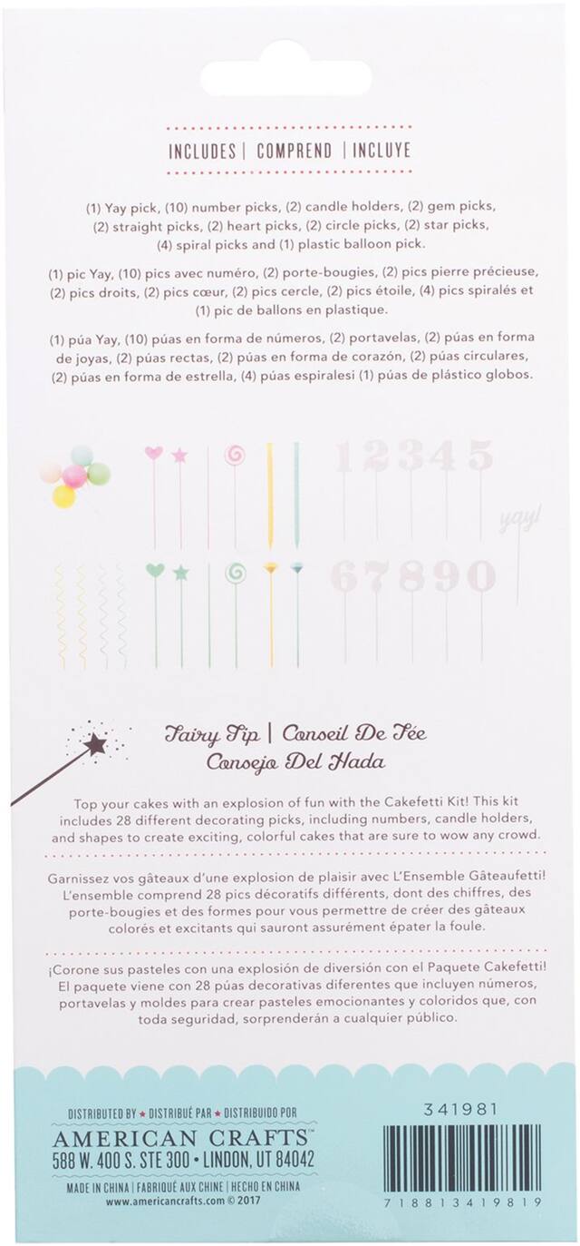 Features 28 different decorating picks including candle holders and numbers and shapes to create a cake bursting with excitement