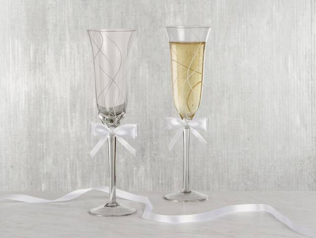 You may be interested in these similar products shown below.Swirl Toasting Glass with White Bow features flared rims and a swirl pattern