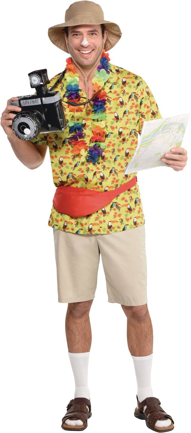 Features a jumbo inflatable camera with an attached neck strap, a tan booney hat with an attached drawstring, and a map prop so you can look like you're lost