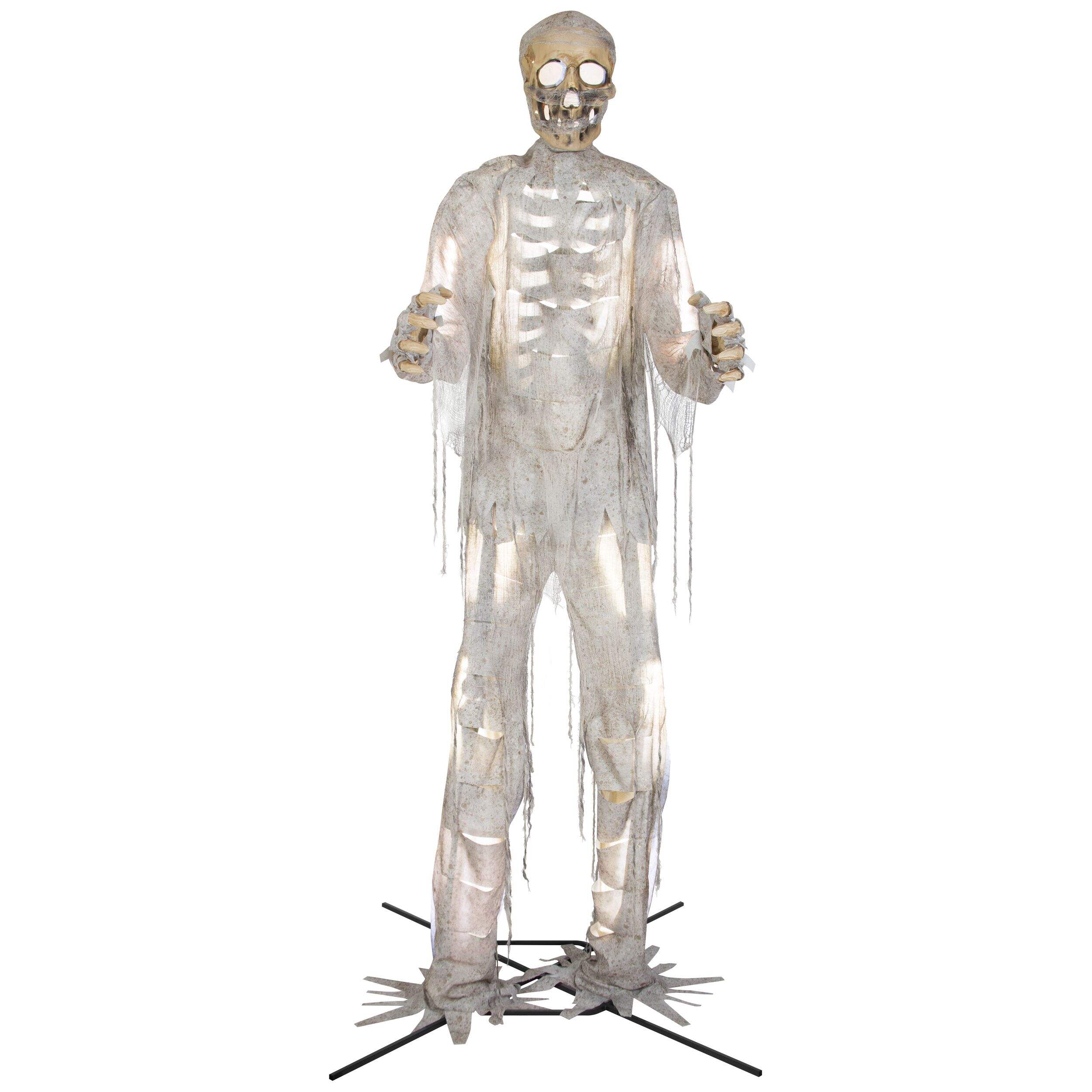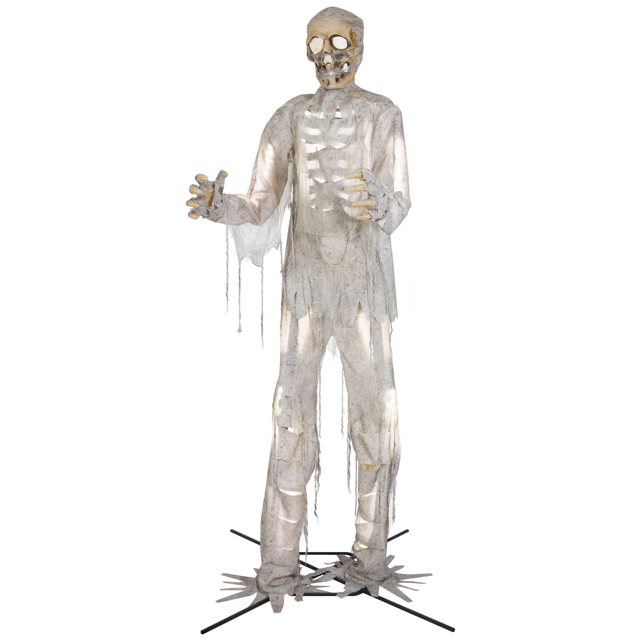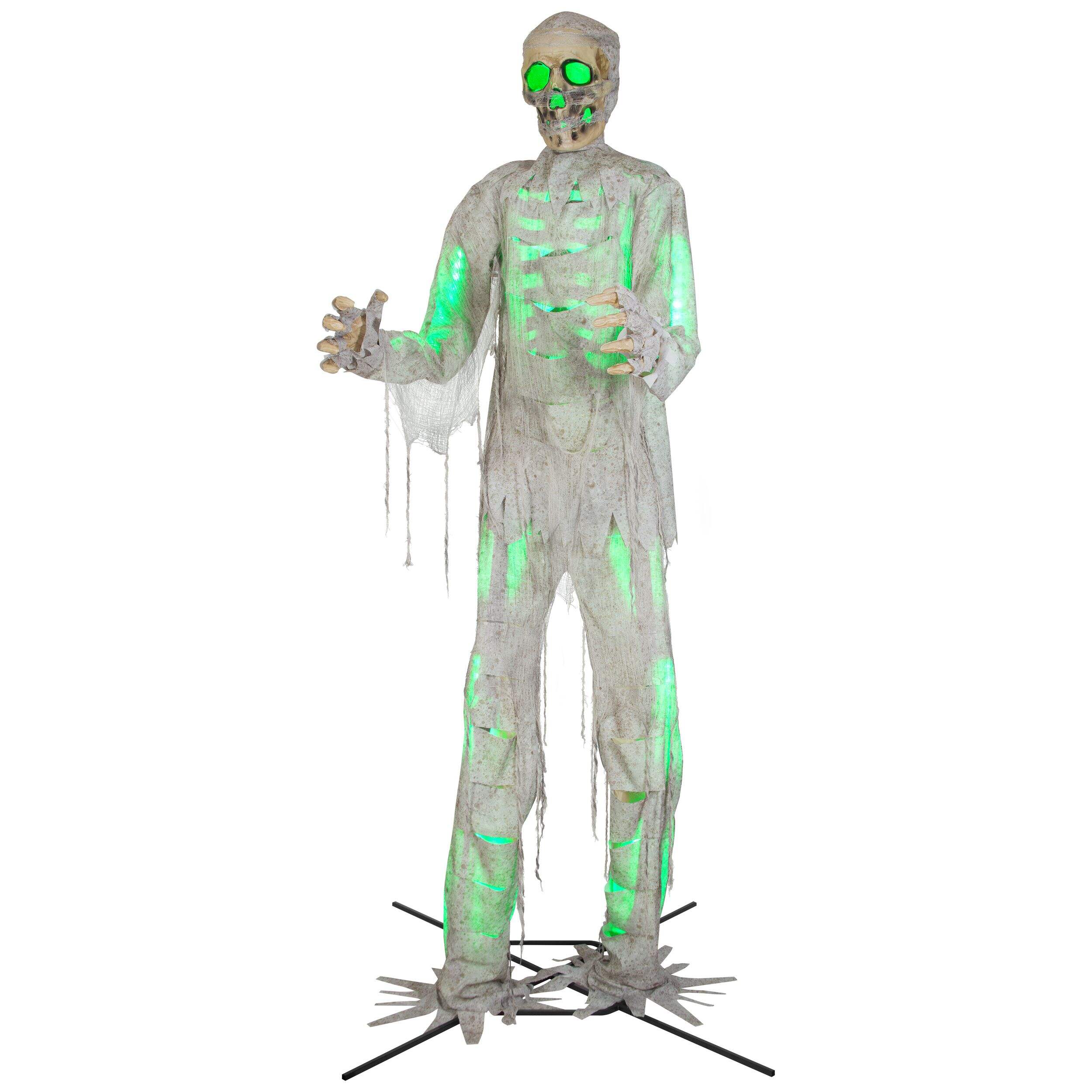 Make your house the spookiest house on the street by decorating with this 12-ft Gemmy Talking Animated Mummy with Lights. This giant animated mummy is draped in distressed, discoloured rags, glowing eerily with coloured lights, as it turns from side to side making moaning sounds. An eye-catching display that adds sound and animation to your Halloween décor, this talking mummy is sure to be the talk of the neighbourhood.