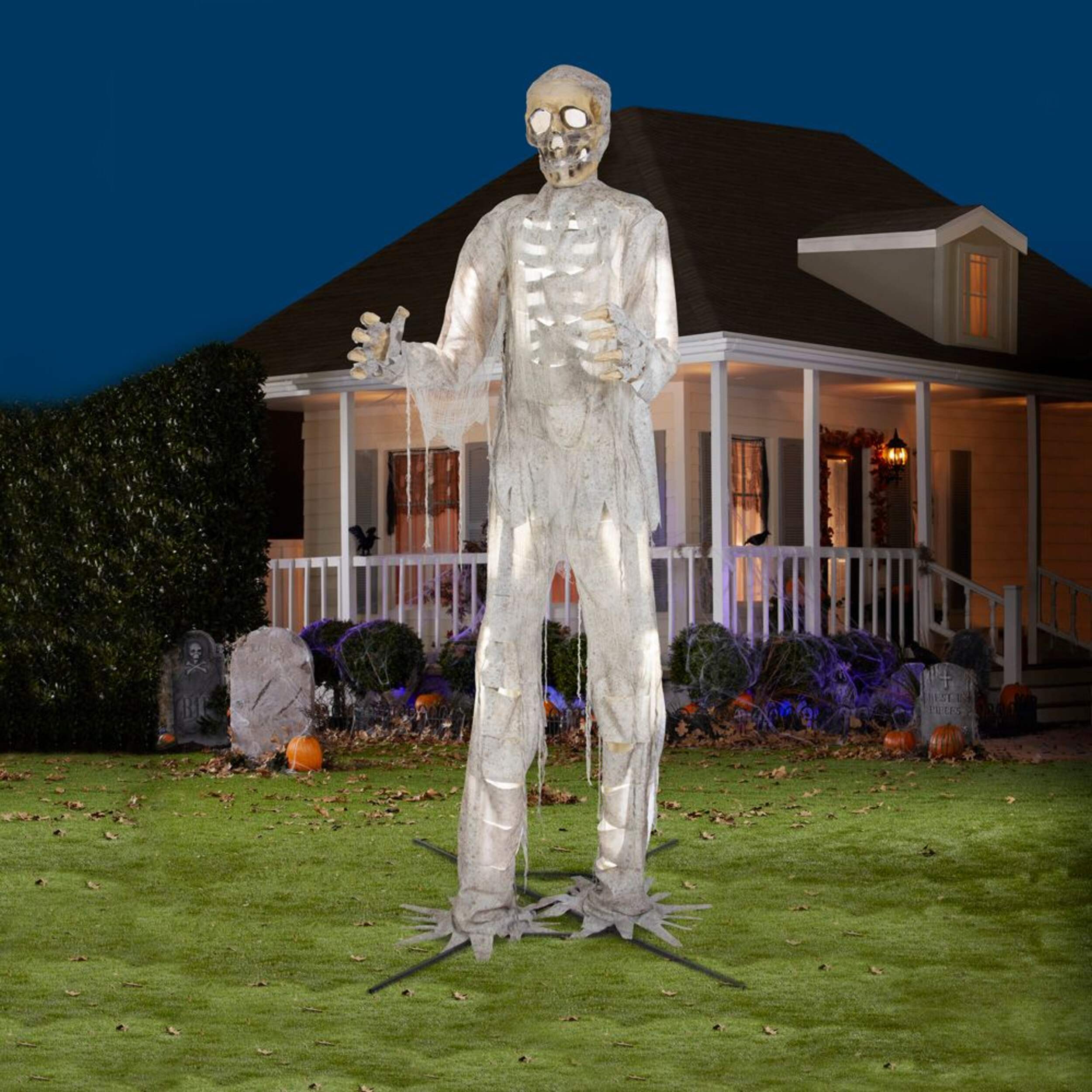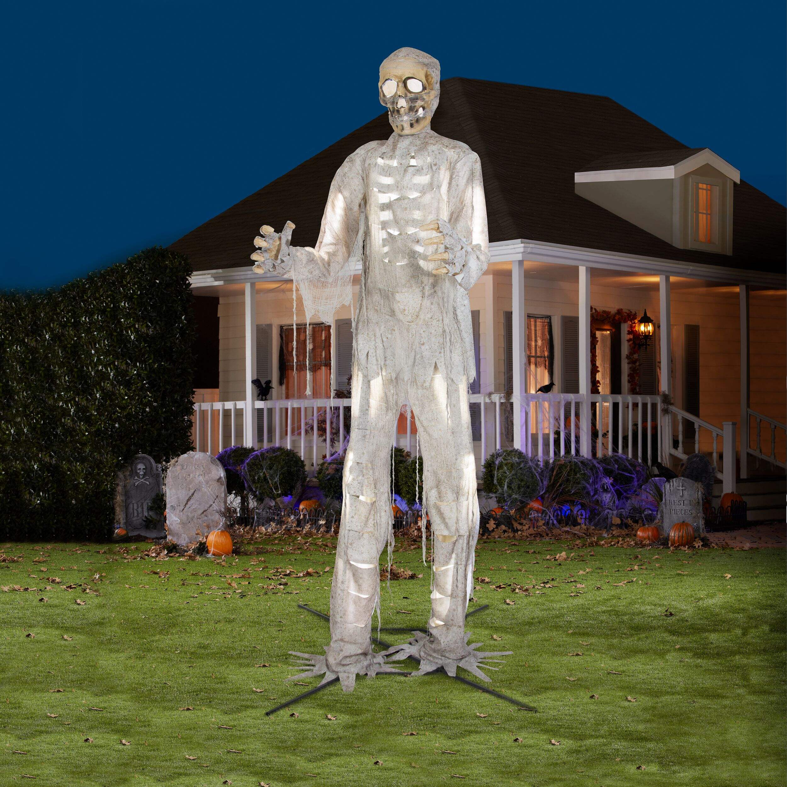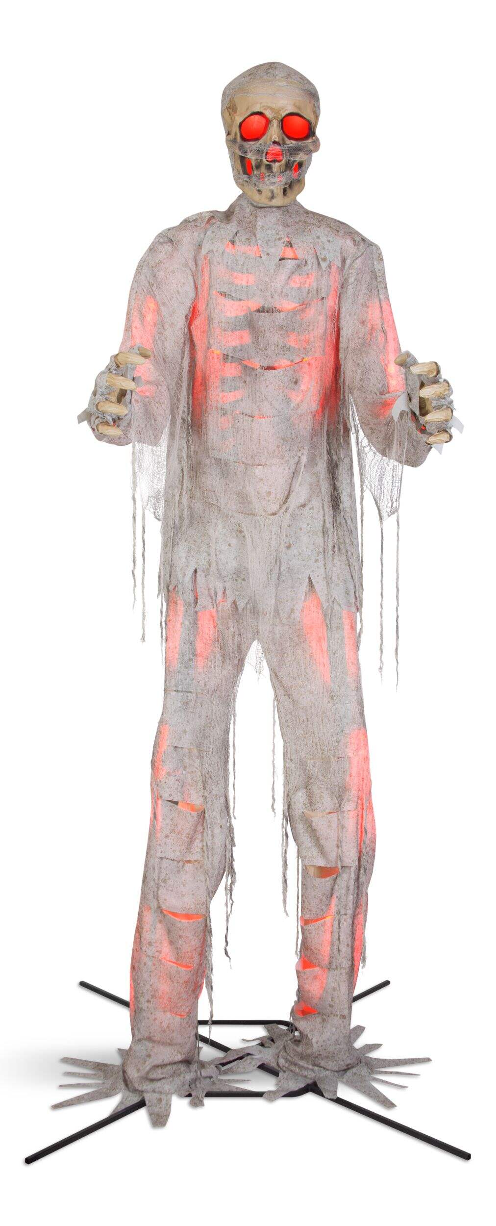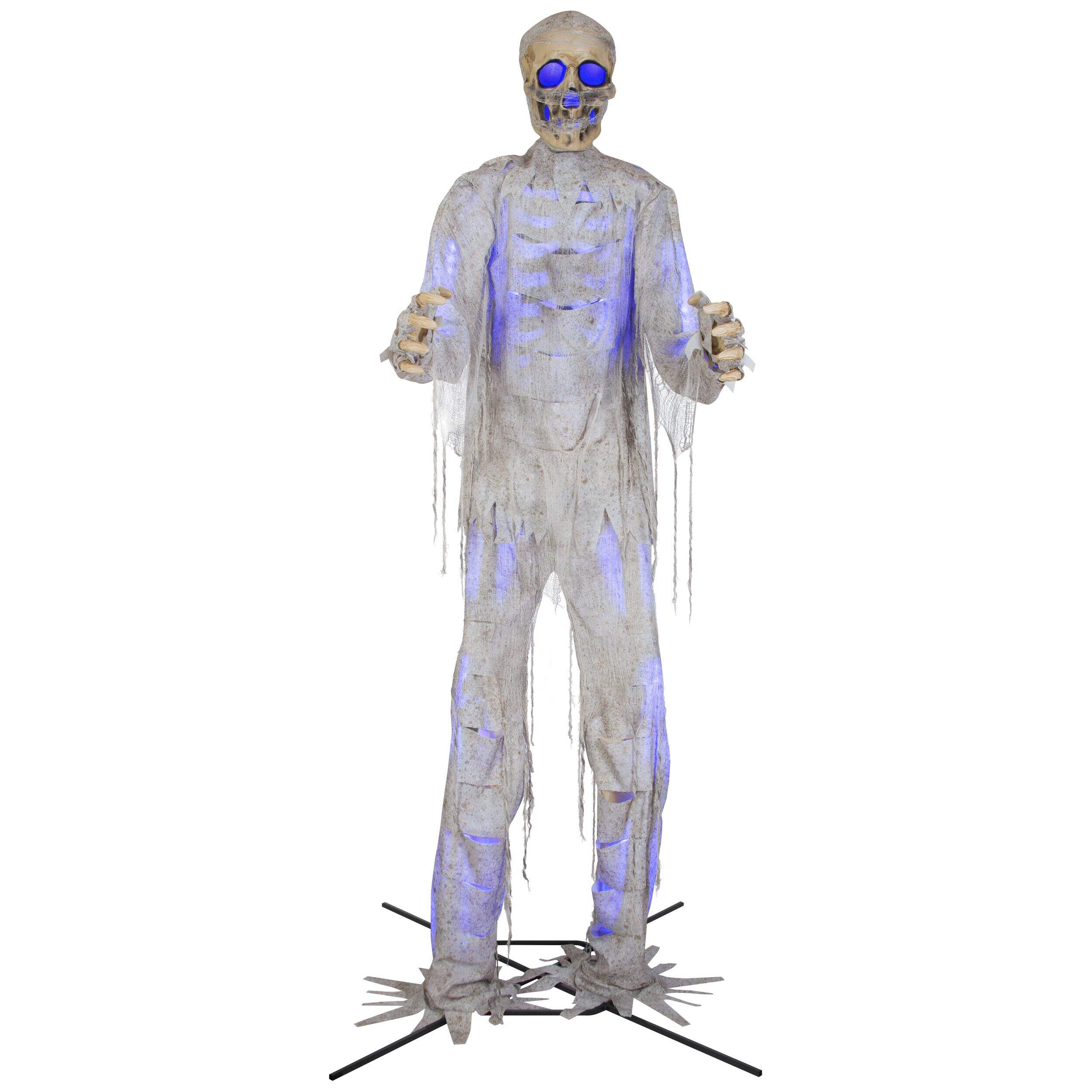 Make your house the spookiest house on the street by decorating with this 12-ft Gemmy Talking Animated Mummy with Lights. This giant animated mummy is draped in distressed, discoloured rags, glowing eerily with coloured lights, as it turns from side to side making moaning sounds. An eye-catching display that adds sound and animation to your Halloween décor, this talking mummy is sure to be the talk of the neighbourhood.