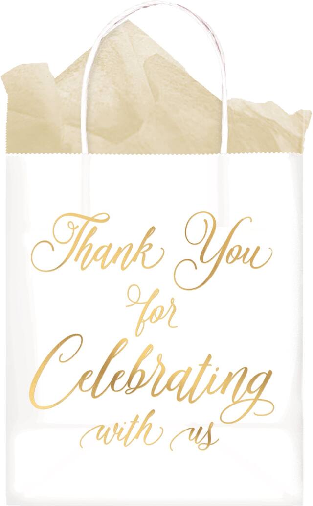 Each white bag features a "Thank You For Celebrating With Us" message in shiny gold