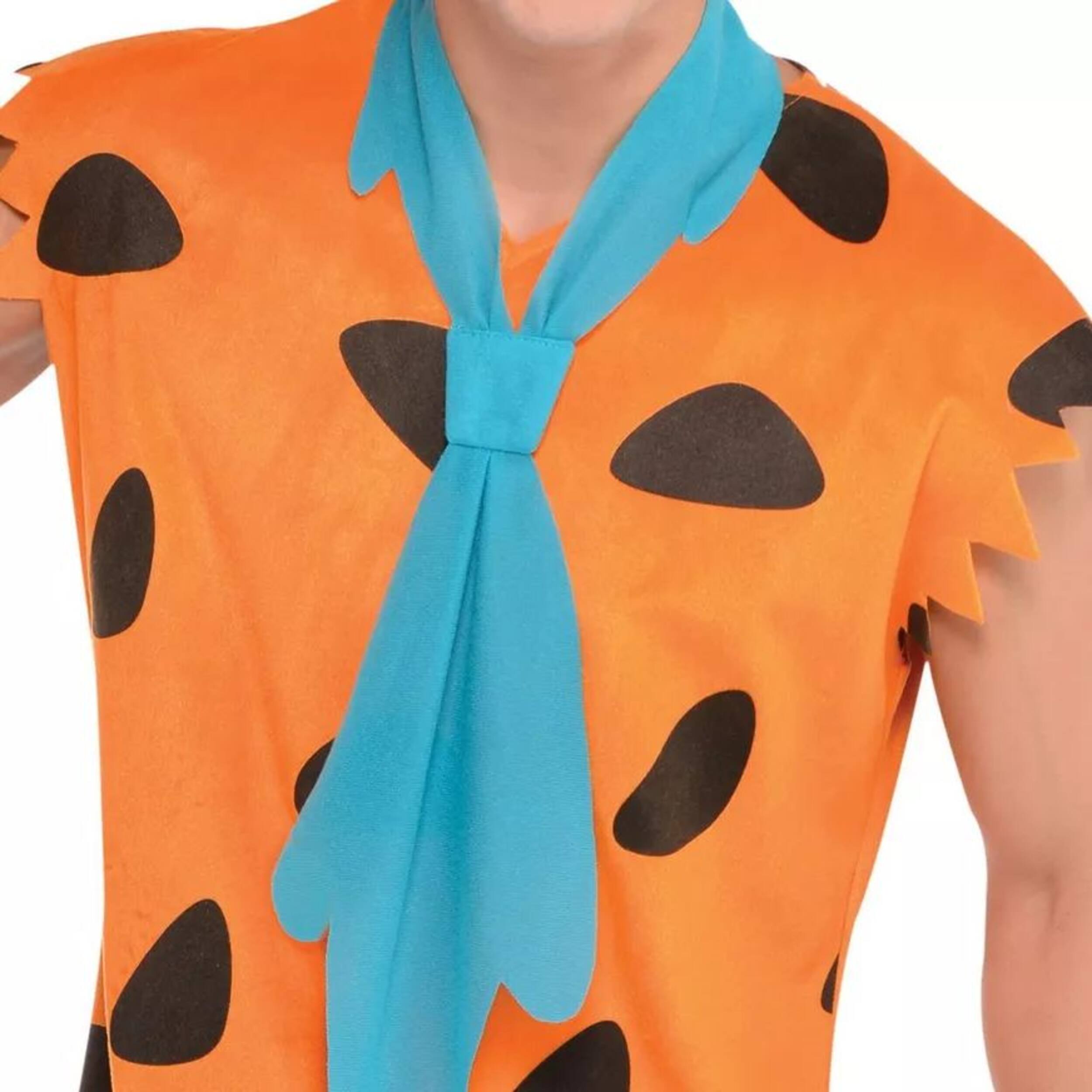 The Flintstones Fred Flintstone Halloween Costume features an oversized orange spotted shirt with a jagged hem and a bright blue tie