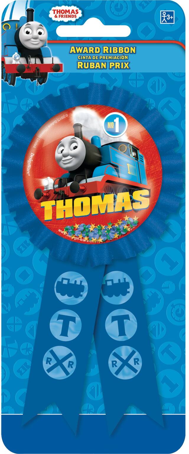 Blue award ribbon features various train-related symbols and a round, red medallion featuring Thomas the Tank Engine