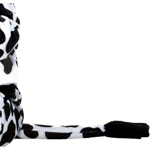 Includes a cow-print jumpsuit and a matching hood designed to look like a cow's face