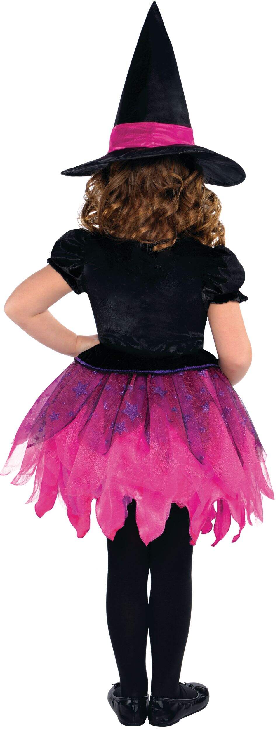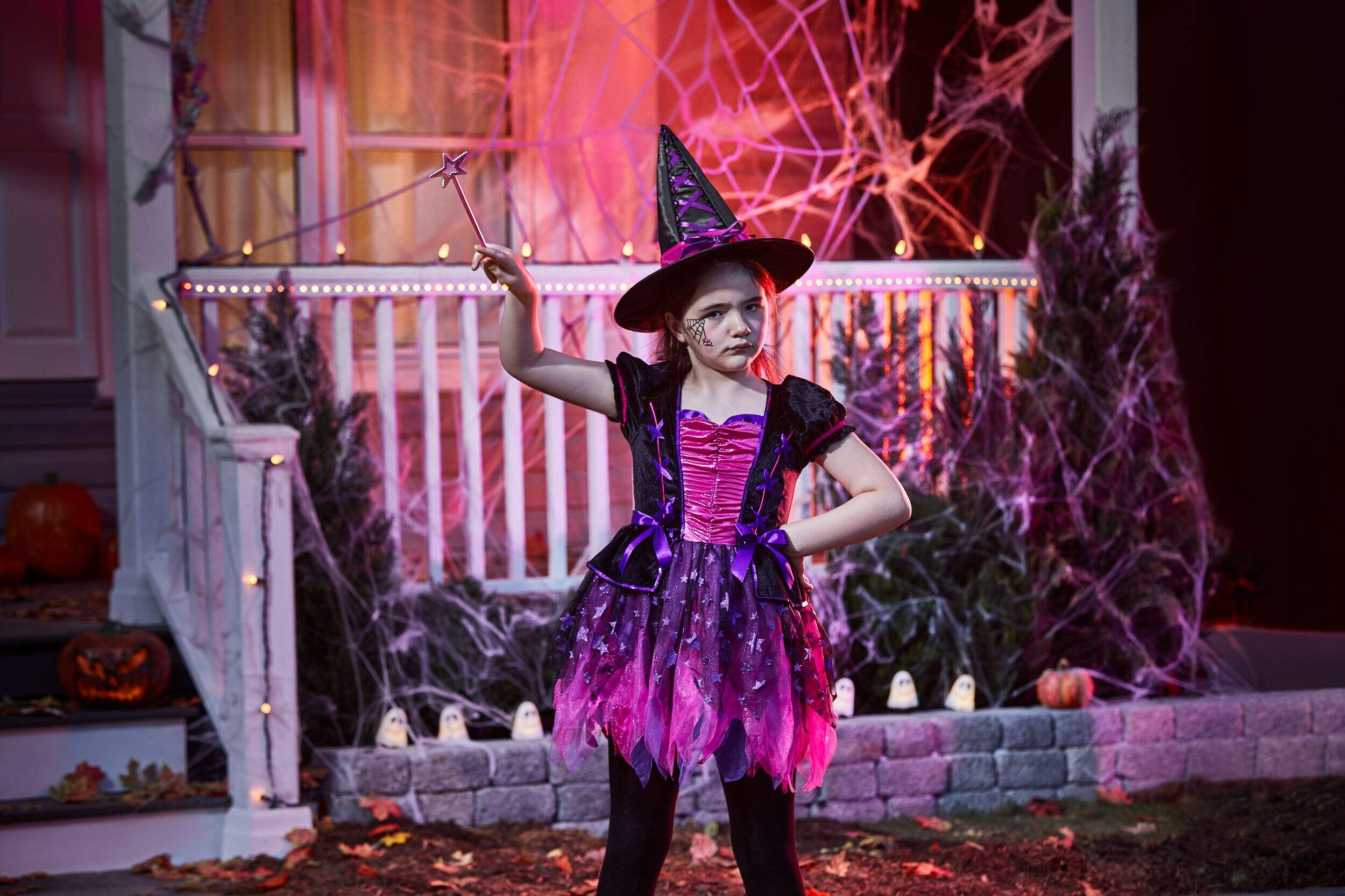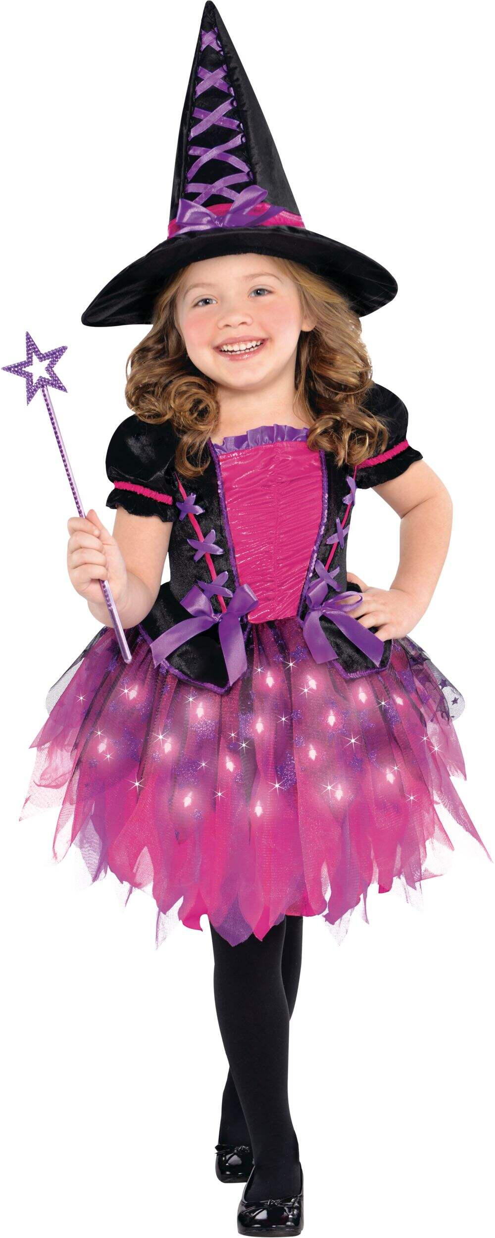 The Kids' Light-Up Sparkle Witch Costume features a colourful pink, purple and black dress with a tutu skirt