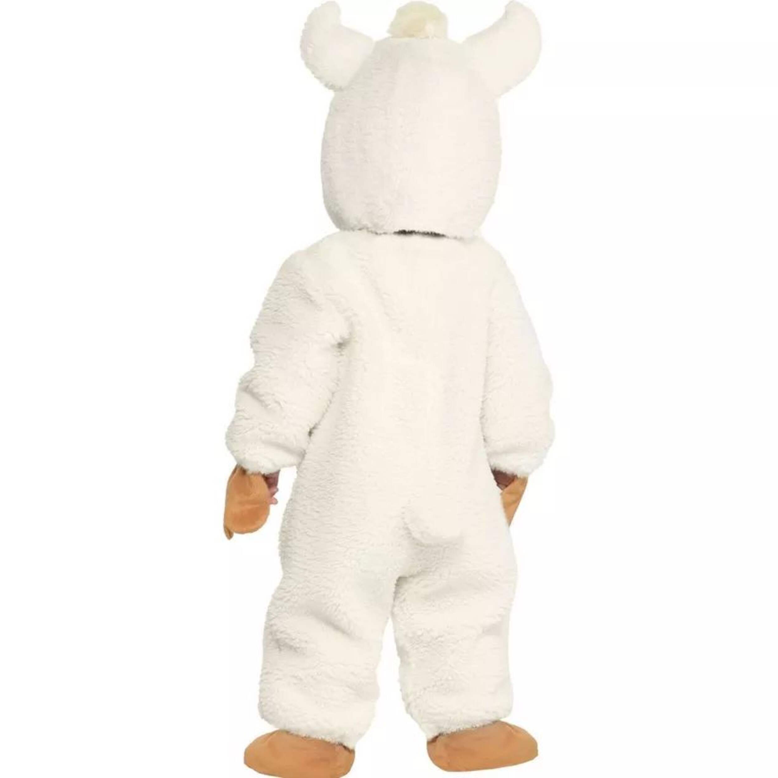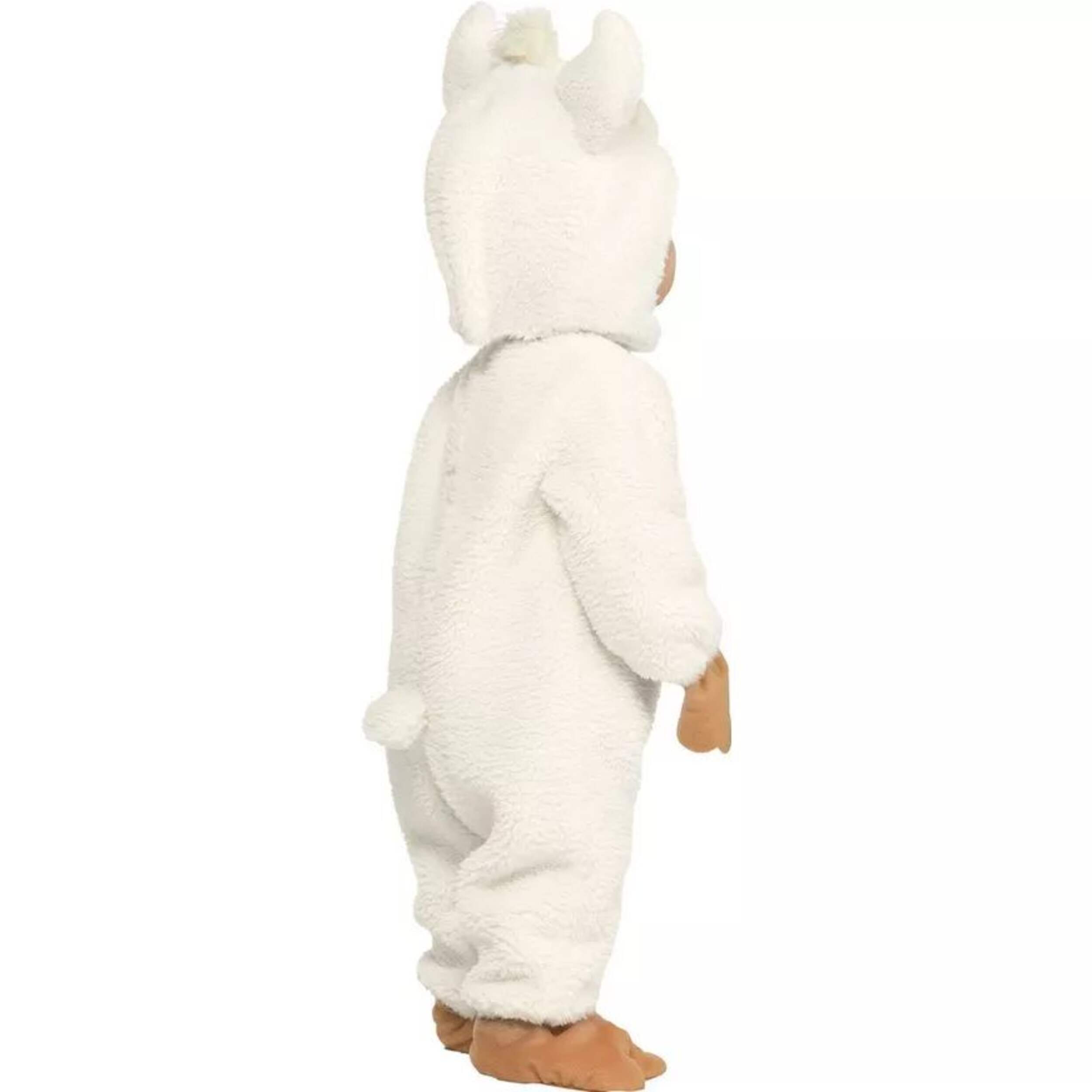 Adorable costume includes a fluffy onesie, matching booties, and a llama head hood