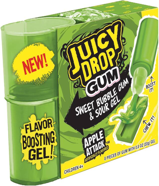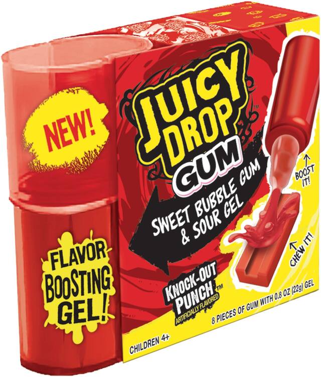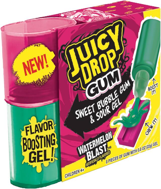 You may be interested in these similar products shown below.Topps Juicy Drop Gum includes knock out punch, blue rebel, watermelon blast, and apple attack flavours
