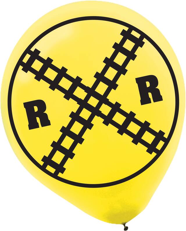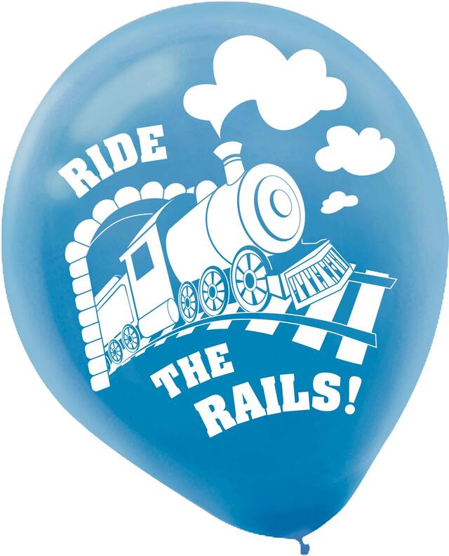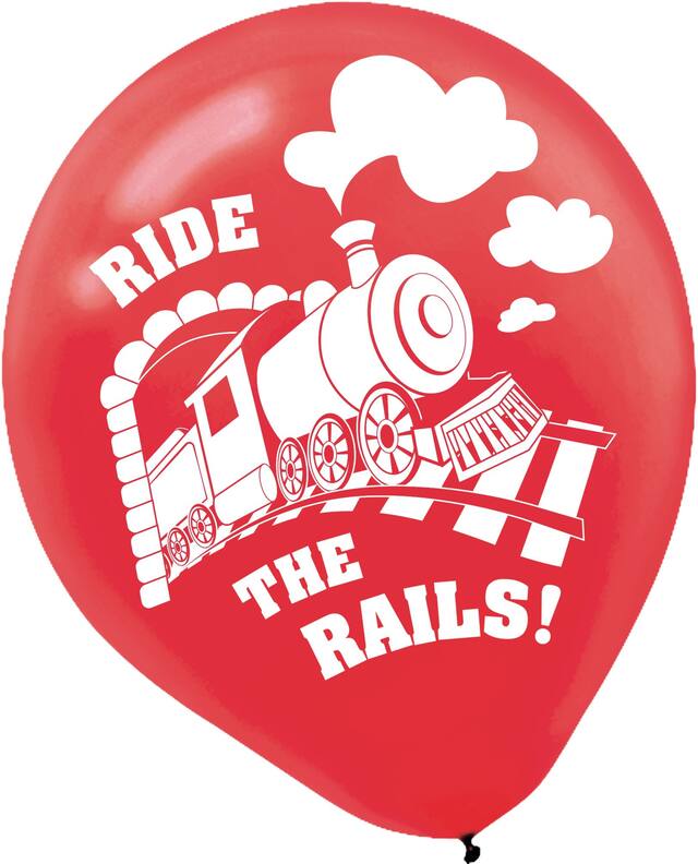 Blue and red balloons feature a steam train on a railroad with the headline "Ride the Rails!" and yellow balloons feature a railroad crossing sign