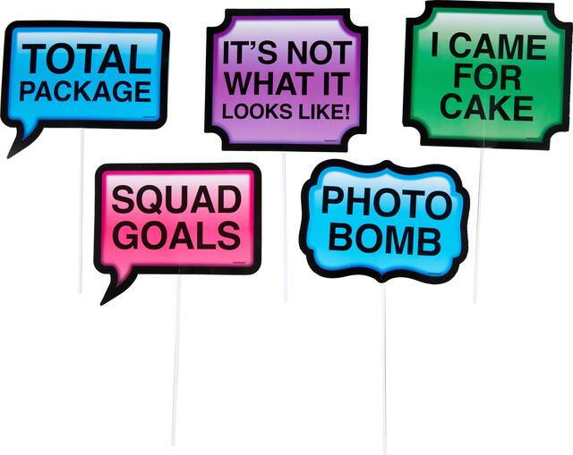 You may be interested in these similar products shown below.Trendy Phrases Photo Booth Props feature cutouts in various shapes and colours