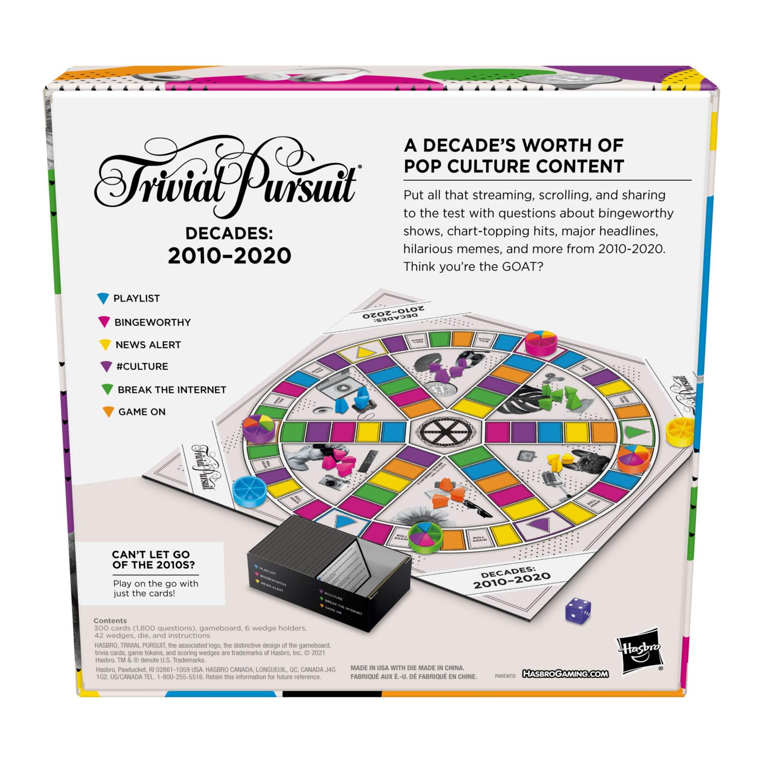 GAME FOR 2 TO 6 PLAYERS: The Trivial Pursuit Decades 2010 to 2020 board game is a great choice for parties and game night with friends and family; you can also play it on the go with just the cards