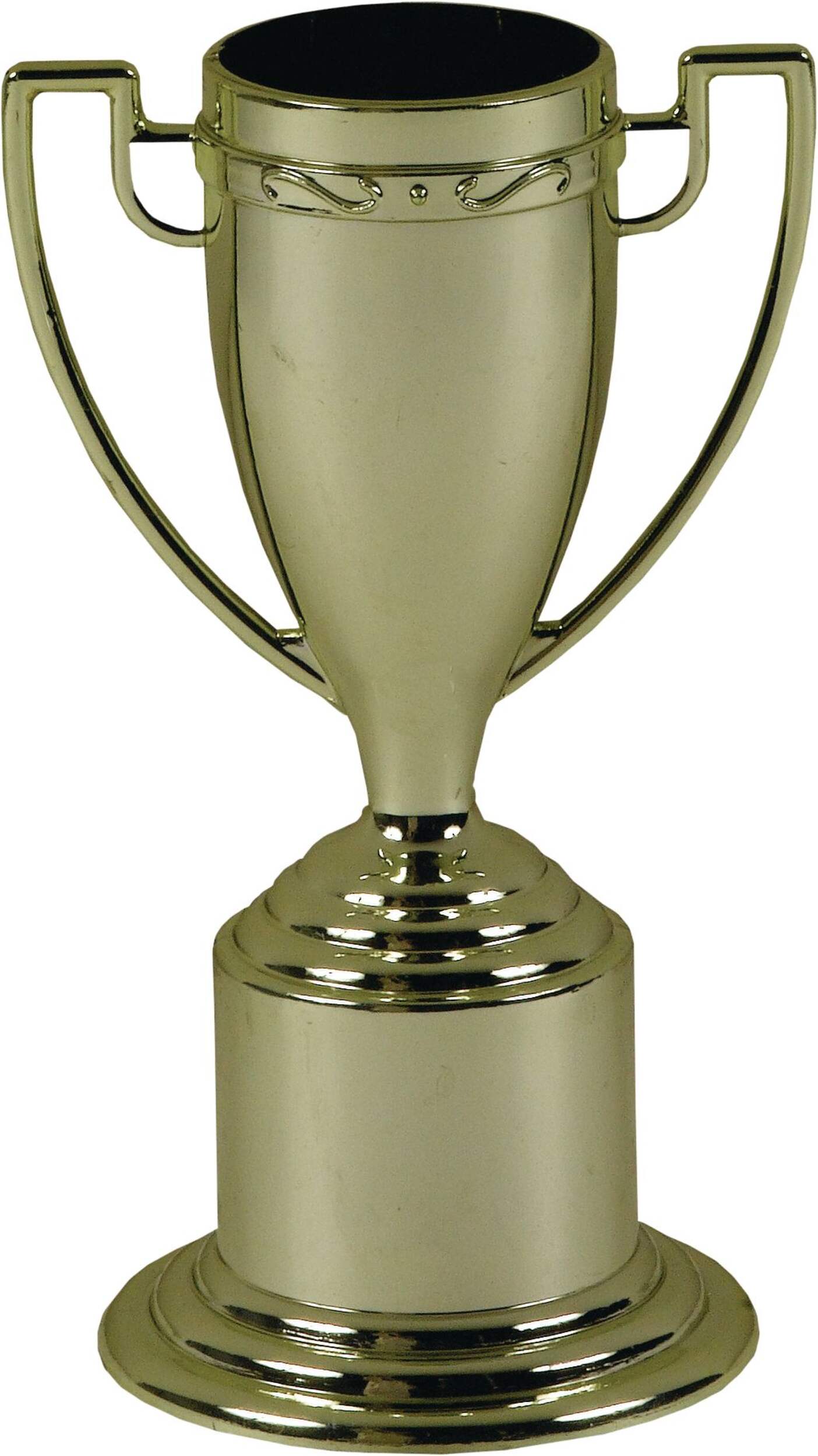 Small plastic trophies resemble real gold trophies, featuring the classic cup and base design