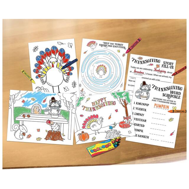 Images of turkeys and raccoons decorate each activity sheet, and an answer key helps kids when they get stumped