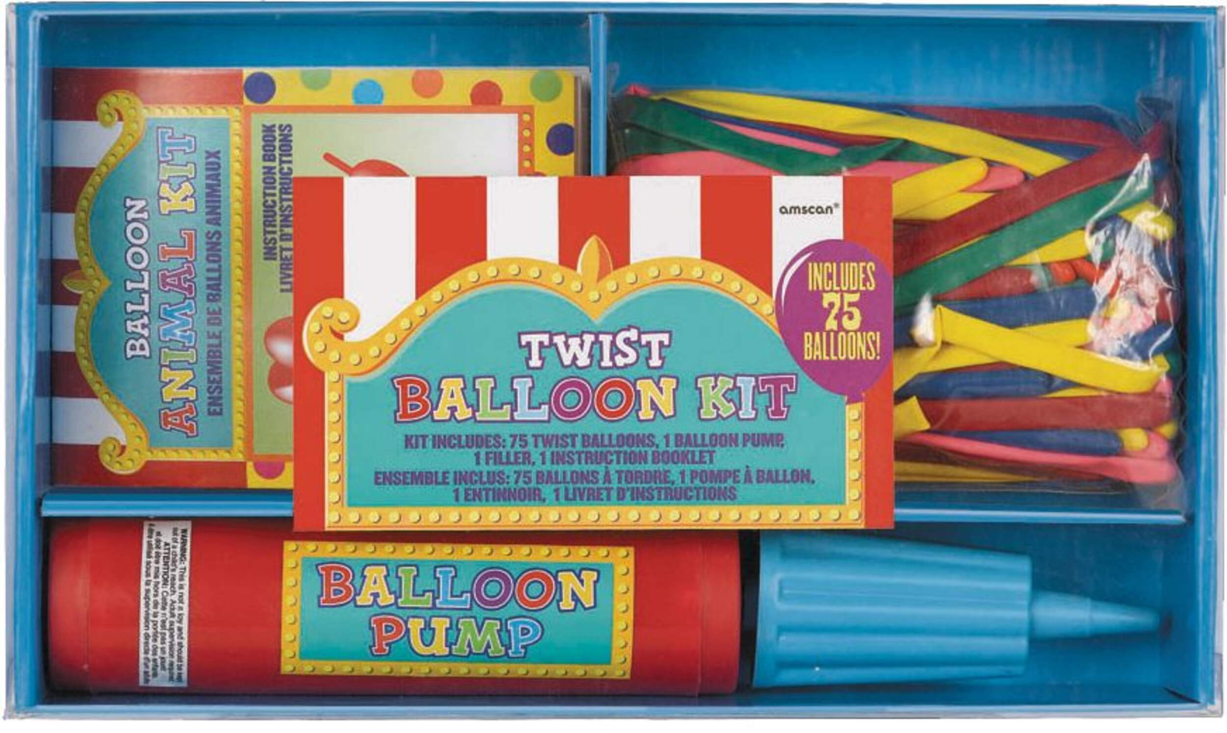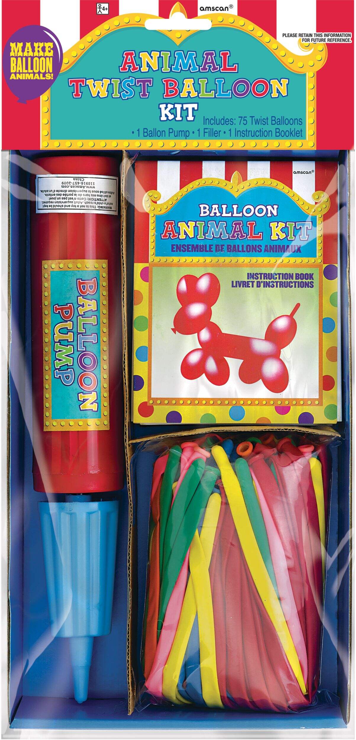 Includes 75 twist balloons, balloon pump, and instruction booklet