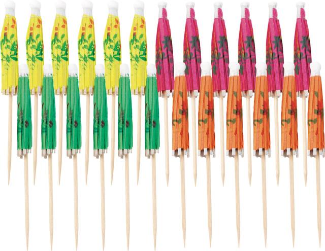 Food safe wooden toothpicks feature bright Asian-style parasols that arrive folded down