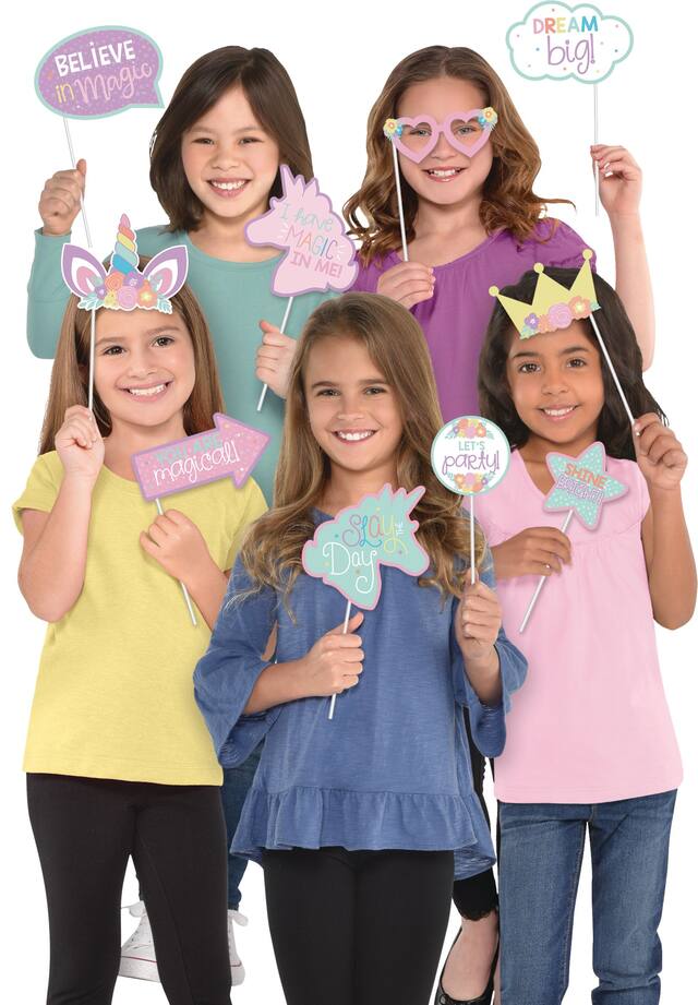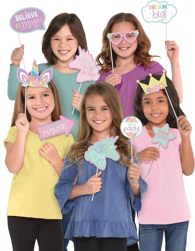 You may be interested in these similar products shown below.Unicorn Party Photo Prop Kit includes thirteen unicorn-themed cardstock cutouts attached to plastic sticks