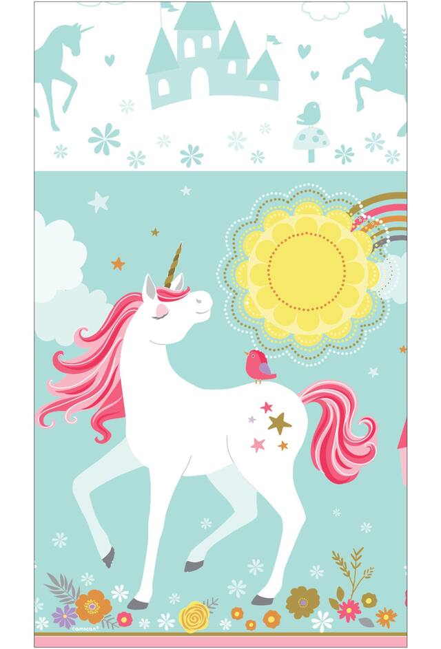 Plastic table cover features images of a pink and white unicorn, castles, rainbows, flowers and animal friends with a turquoise background covered in clouds that go along the sides