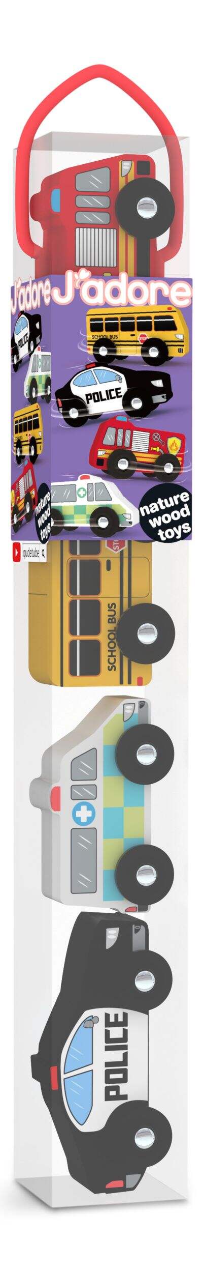 Includes four vehicles: police car, ambulance, school bus, and fire truck