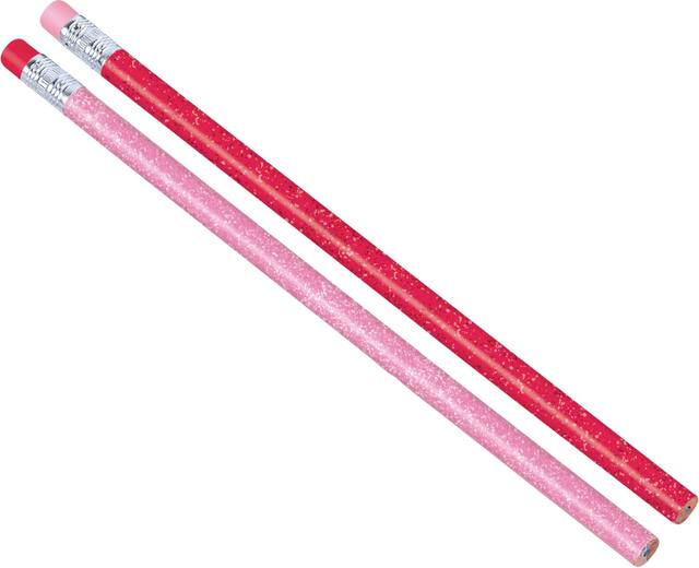Sparkly wooden pencils are coated in pink and red glitter and topped with matching erasers