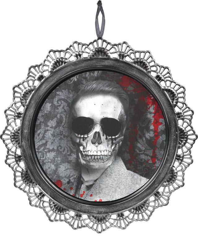 Features a Victorian style skeleton portraits with an intricate metal frame and a blood-splattered finish