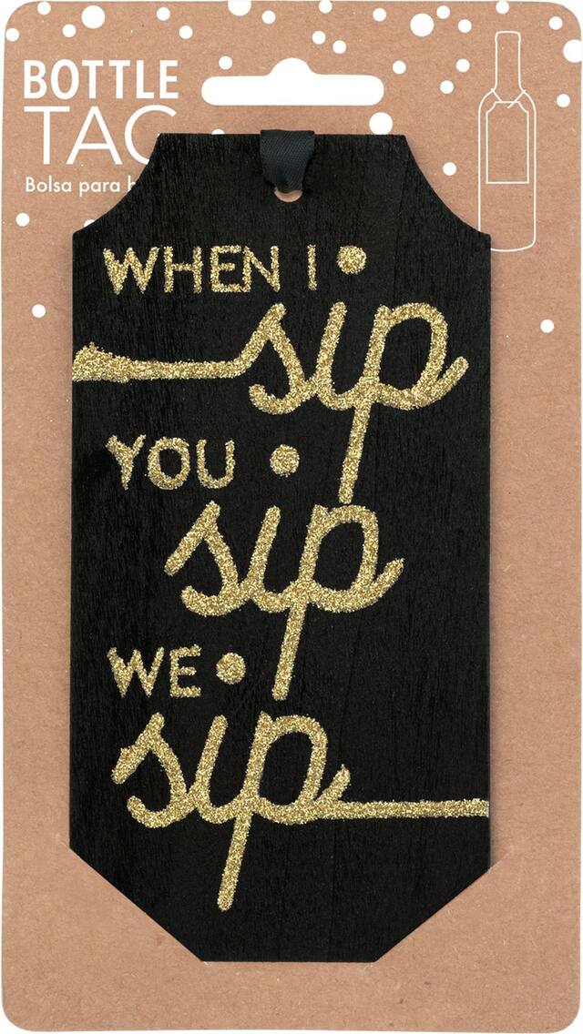 • Wooden tag features the headline "When I Sip You Sip We Sip" in glittery gold writing