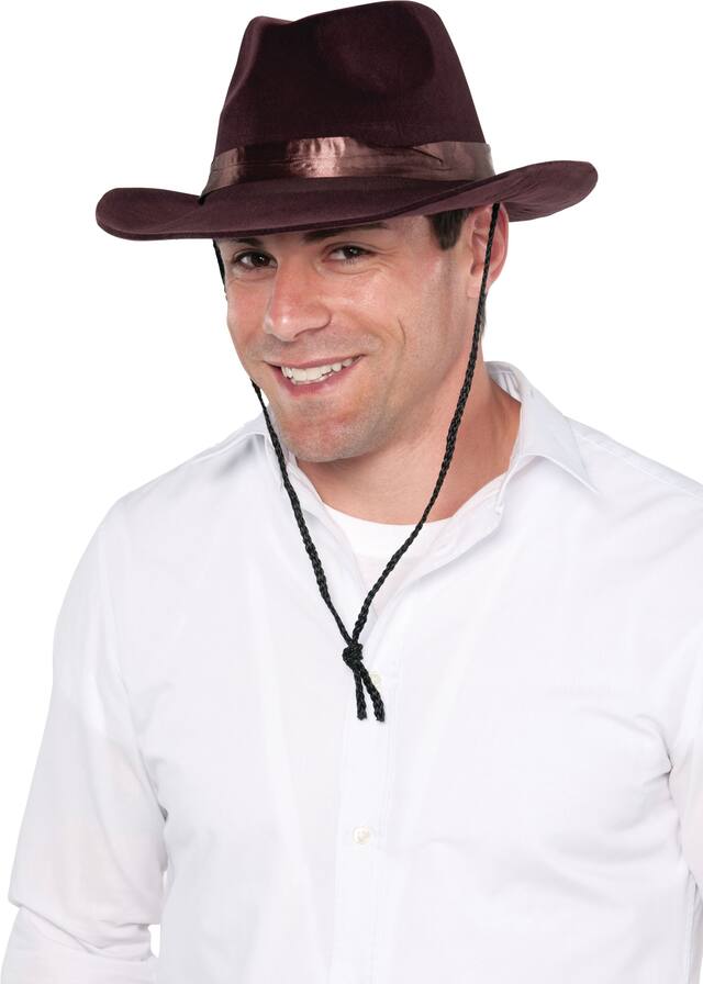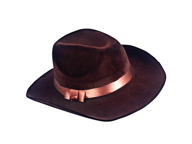 Features a classic western design in dark brown with a rolled brim decorative brown ribbon around the crown and flocked finish
