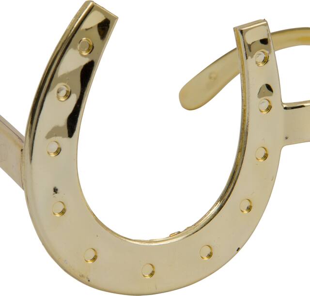 Lightweight glasses feature plastic horseshoe frames around each eye and are covered in allover gold