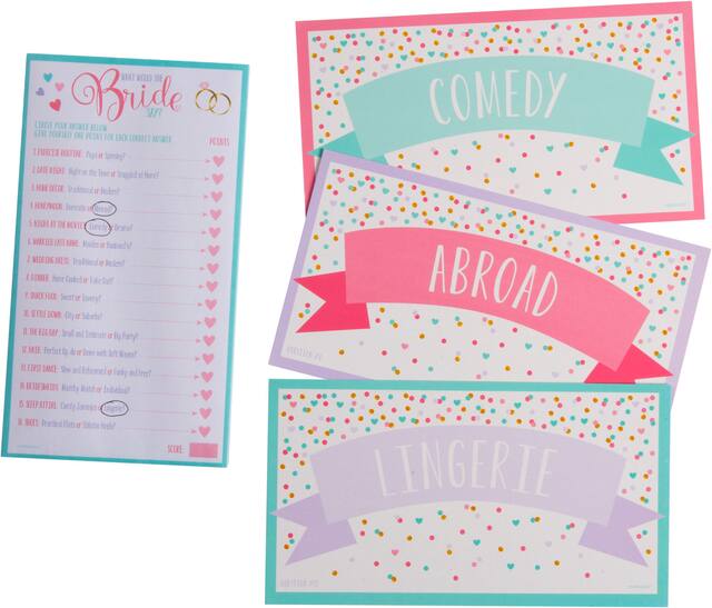 Question-and-answer wedding game has guests ask the bride-to-be 16 fun questions about her taste in wedding dresses, home decor, honeymoon destinations, and more