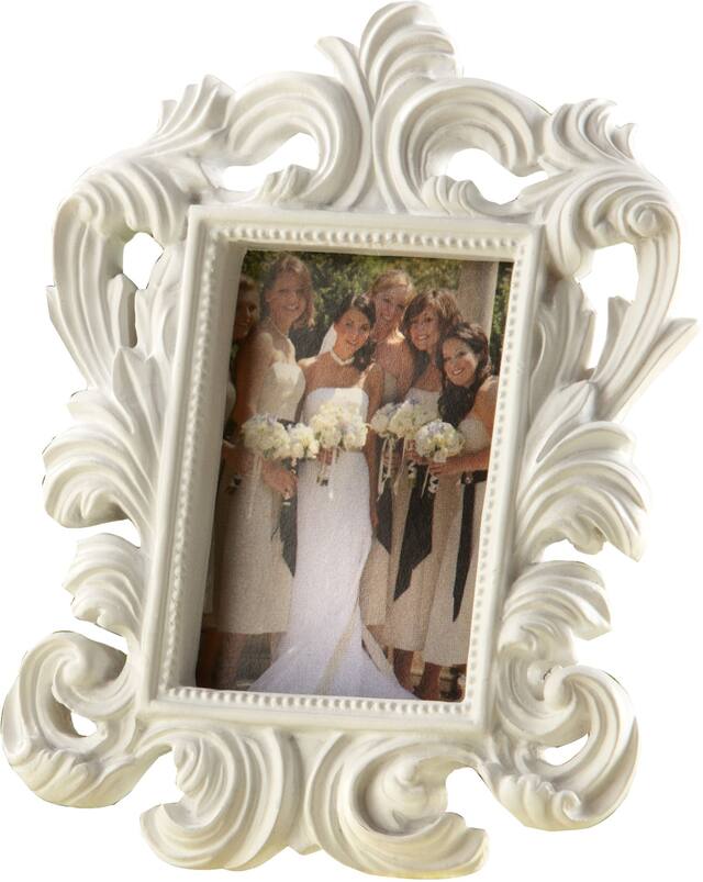 Rectangular resin photo frame has a matte white finish and includes an insert for use as a place card