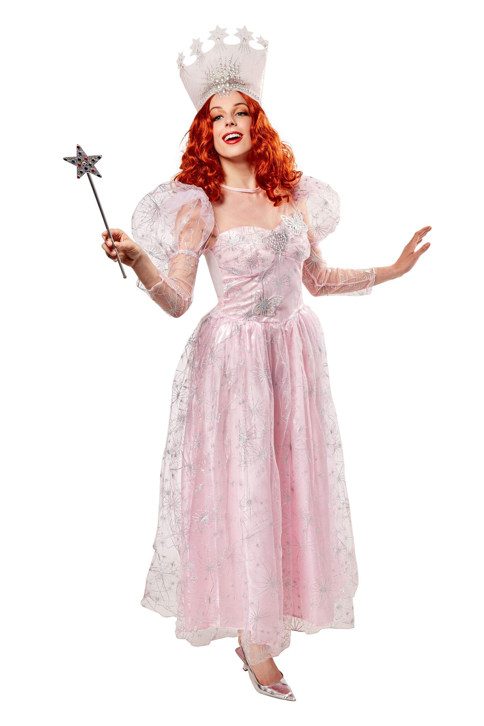 Transform into the enchanting Glinda from Wicked with this stunning Halloween costume. The pink dress, complete with puffy sheer sleeves, exudes elegance, while the tall white light-up crown adds a magical touch. Perfect for any Halloween event, this officially licensed costume ensures you shine as the Good Witch.