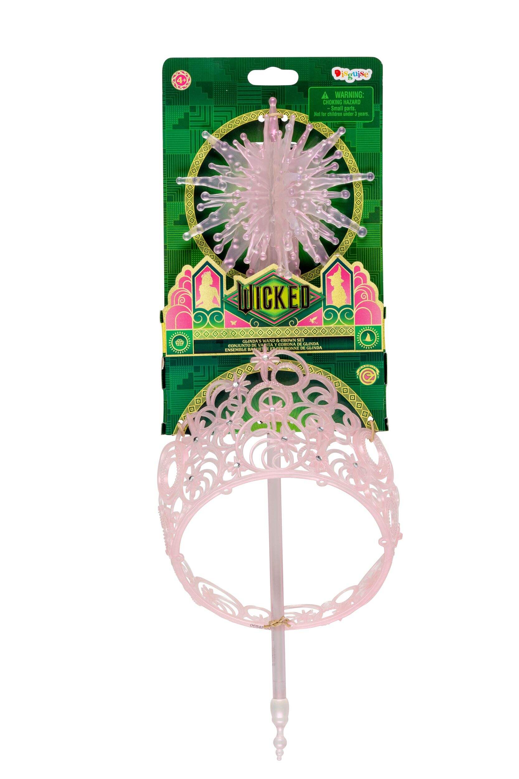 Transform into the enchanting Glinda with this delightful wand and tiara set from Wicked. Perfect for magical adventures, this kit includes a pink wand and a tiara adorned with silver gems, making it an ideal accessory for any costume event.
