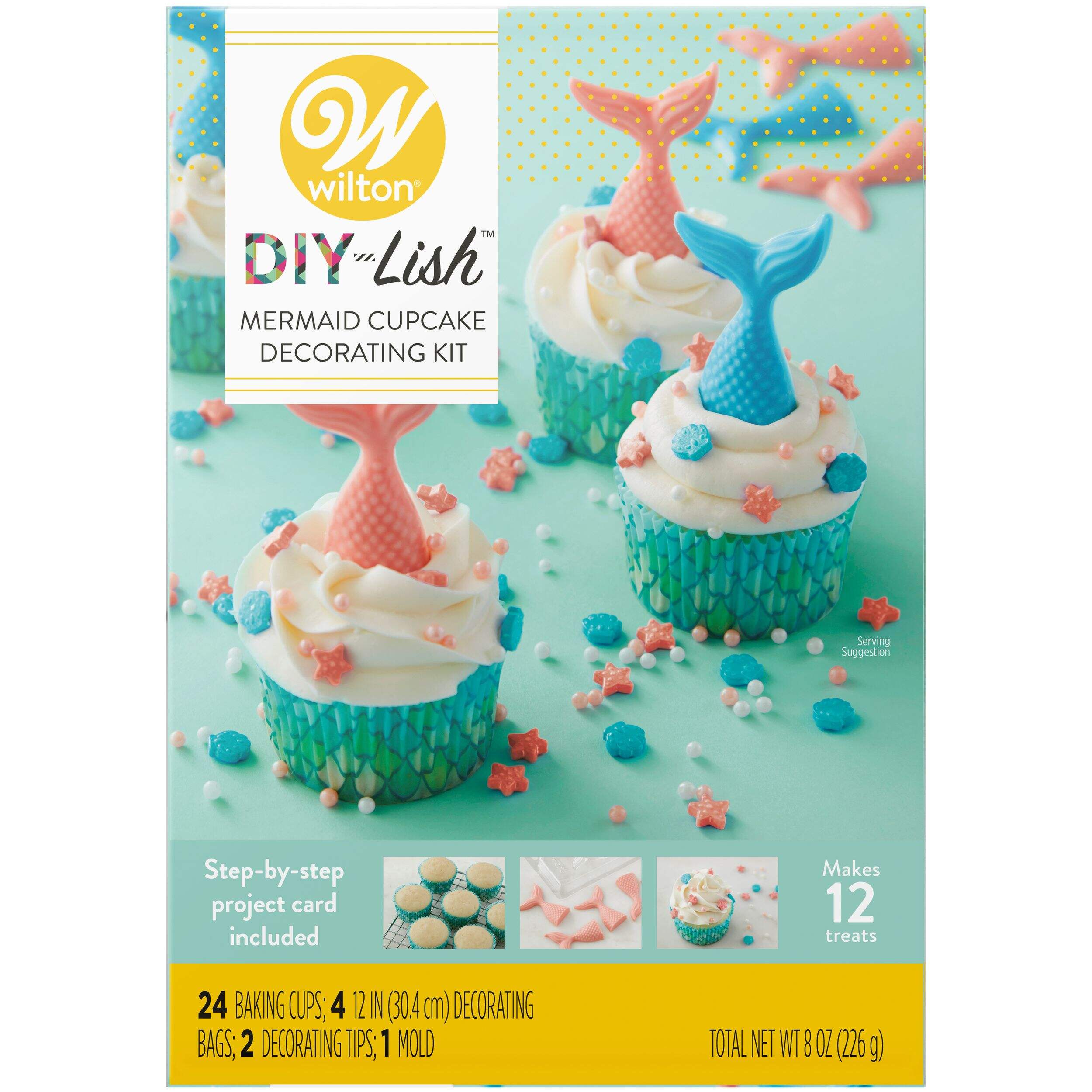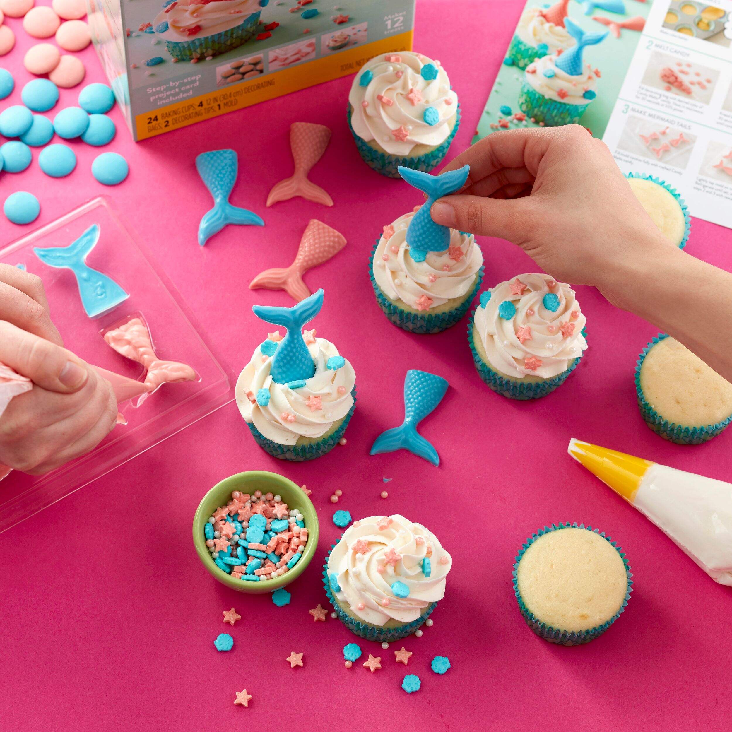 Decorate 12 mermaid cupcakes with this easy-to-use kit. Includes light blue and pink Candy Melts candies, mermaid sprinkles, 24 mermaid baking cups, 4 decorating bags, 2 decorating tips, plastic mold, and project card