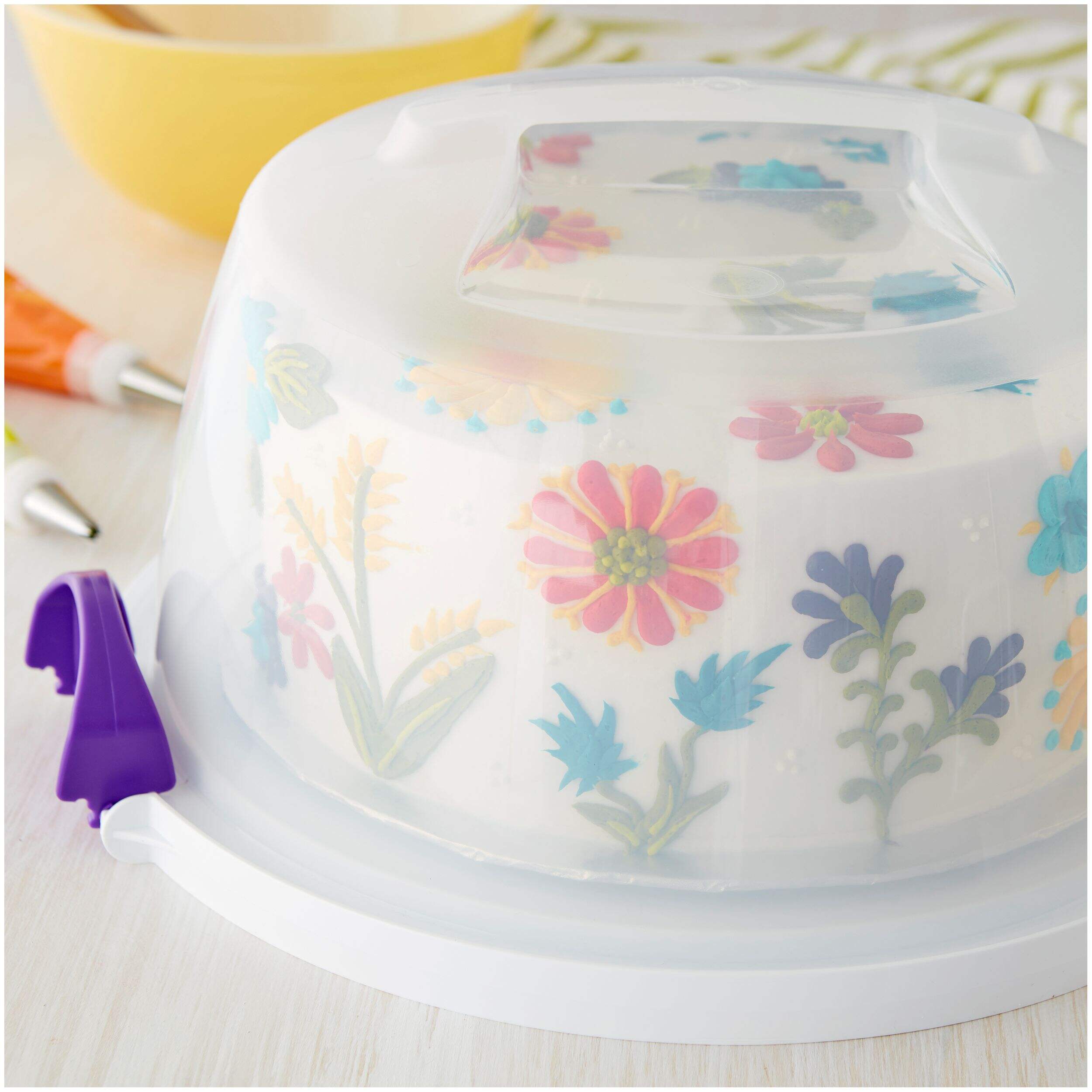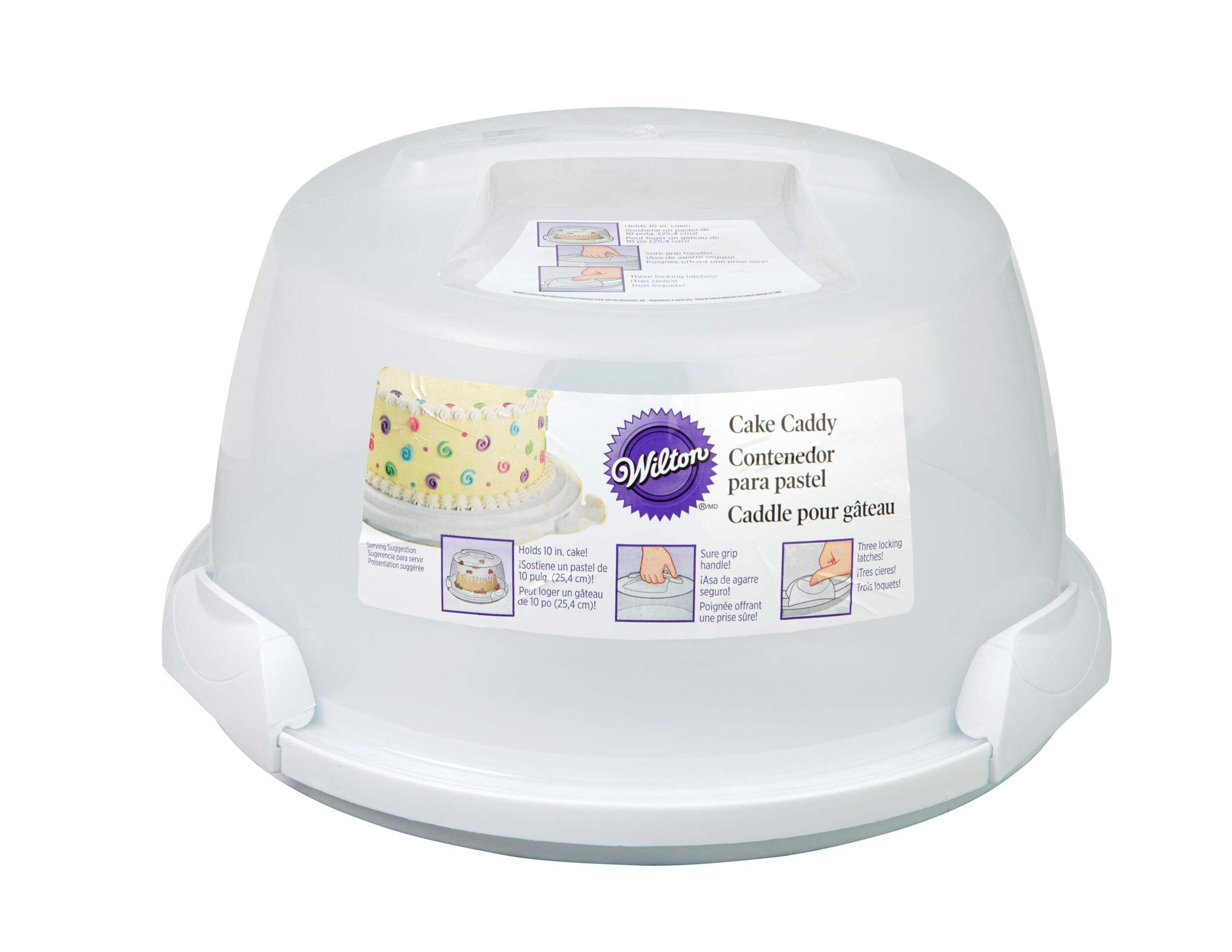The Wilton Plastic Cake Caddy makes transporting your fresh baked sweets easy and secure. At six by thirteen inches, this spacious carrier holds either one 10 inch round cake or up to 13 cupcakes.The reversible plastic base locks tightly to the top portion, ensuring your desserts arrive in one piece. Perfect for birthday parties, potlucks or picnics, this carrier helps you bring your bakery creations to any celebration with ease.